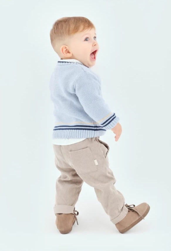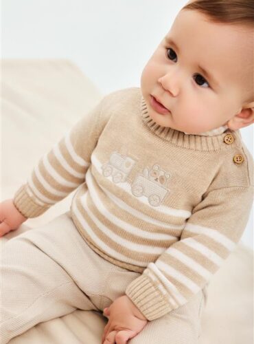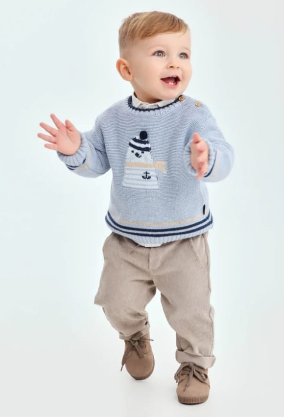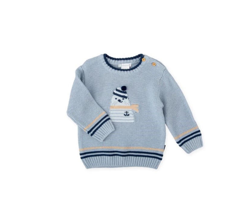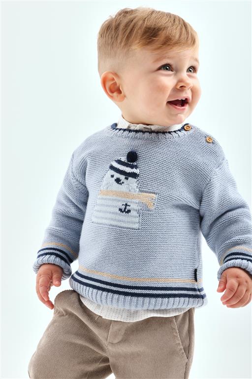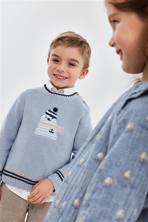 Jersey tricot en color porcelana con decoración delantera. Cuello, puños y bajo de canalé. Abertura hombros con botones, cerrado en tallas grandes.