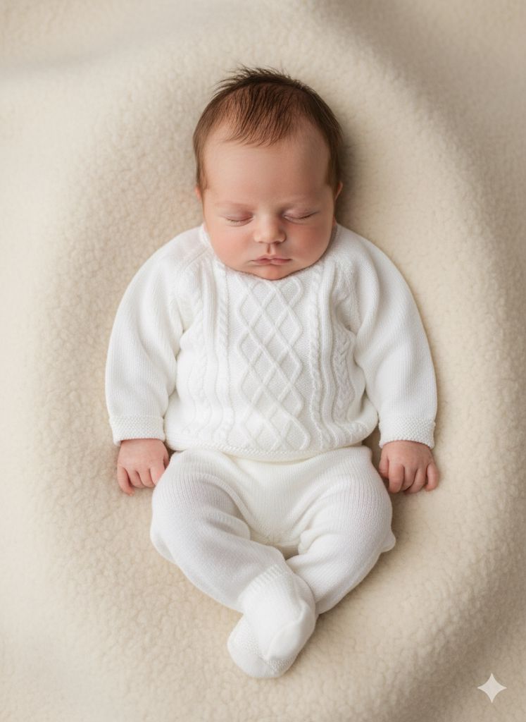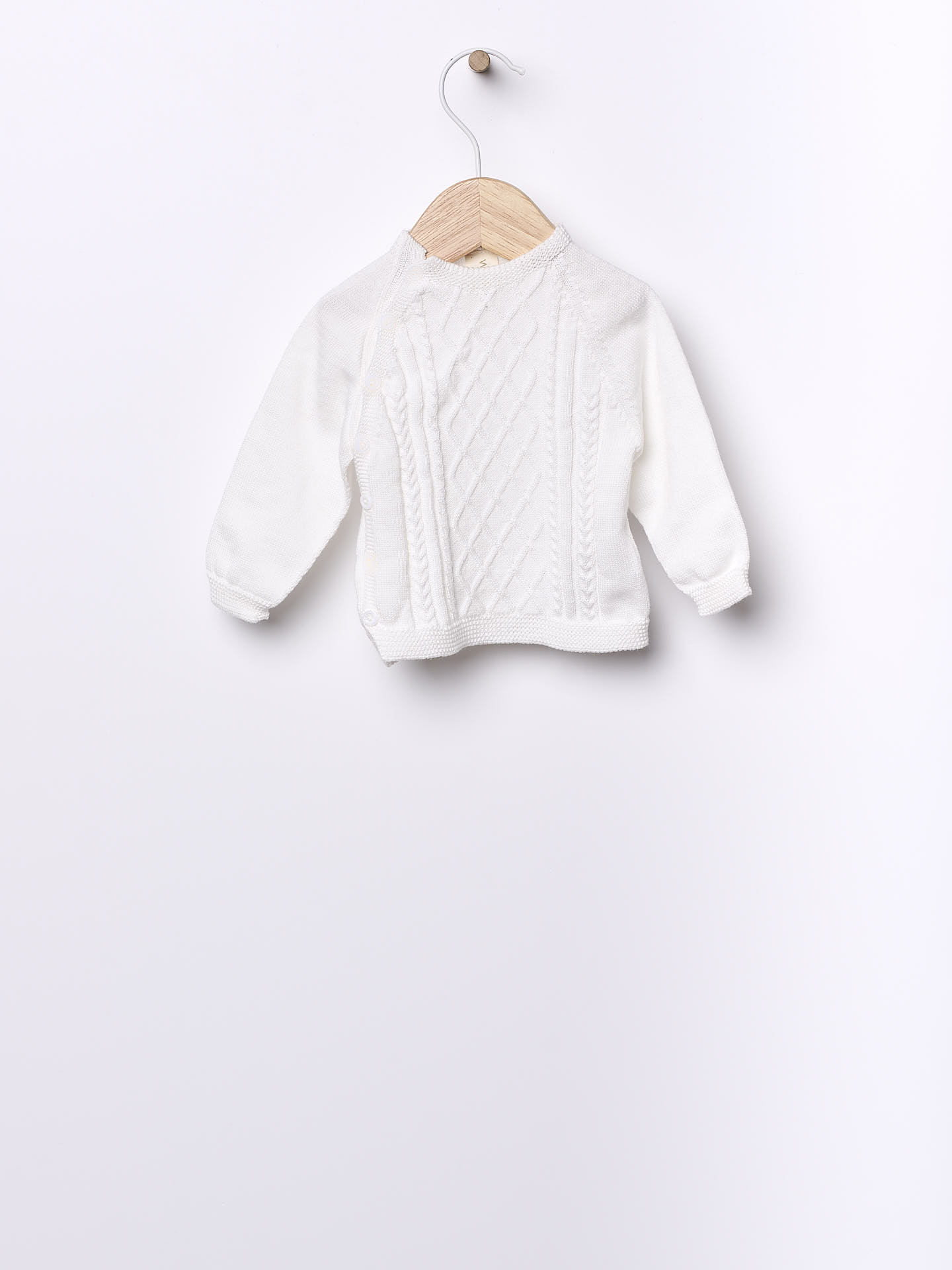 Descubre el encantador jersey tejido en punto de algodón orgánico, una opción suave y transpirable, perfecto para recién nacidos, El jersey de manga larga destaca por su abertura cruzada con botones de nácar, que le aporta practicidad y un toque elegante, esta prenda no tiene costuras para la máxima comodidad de tu bebé.