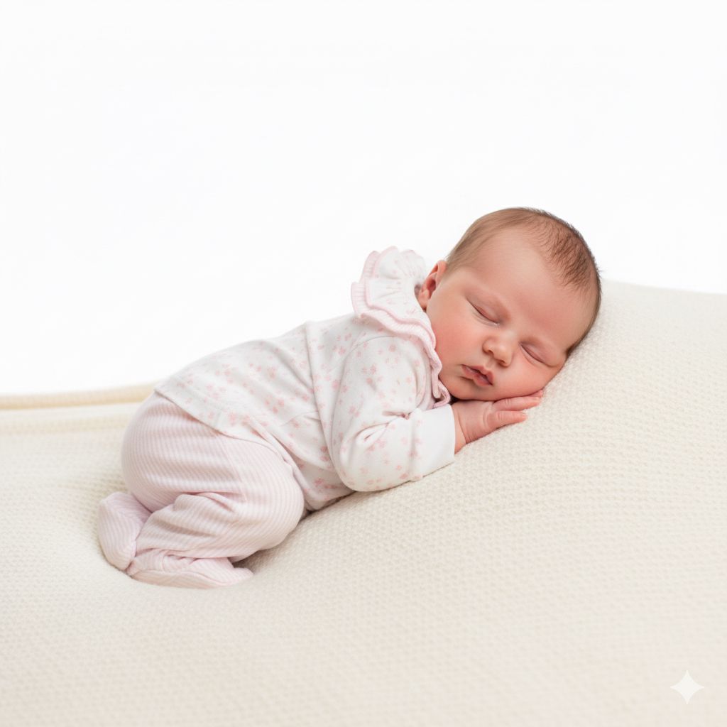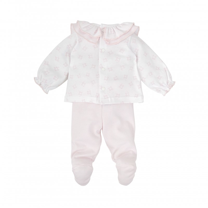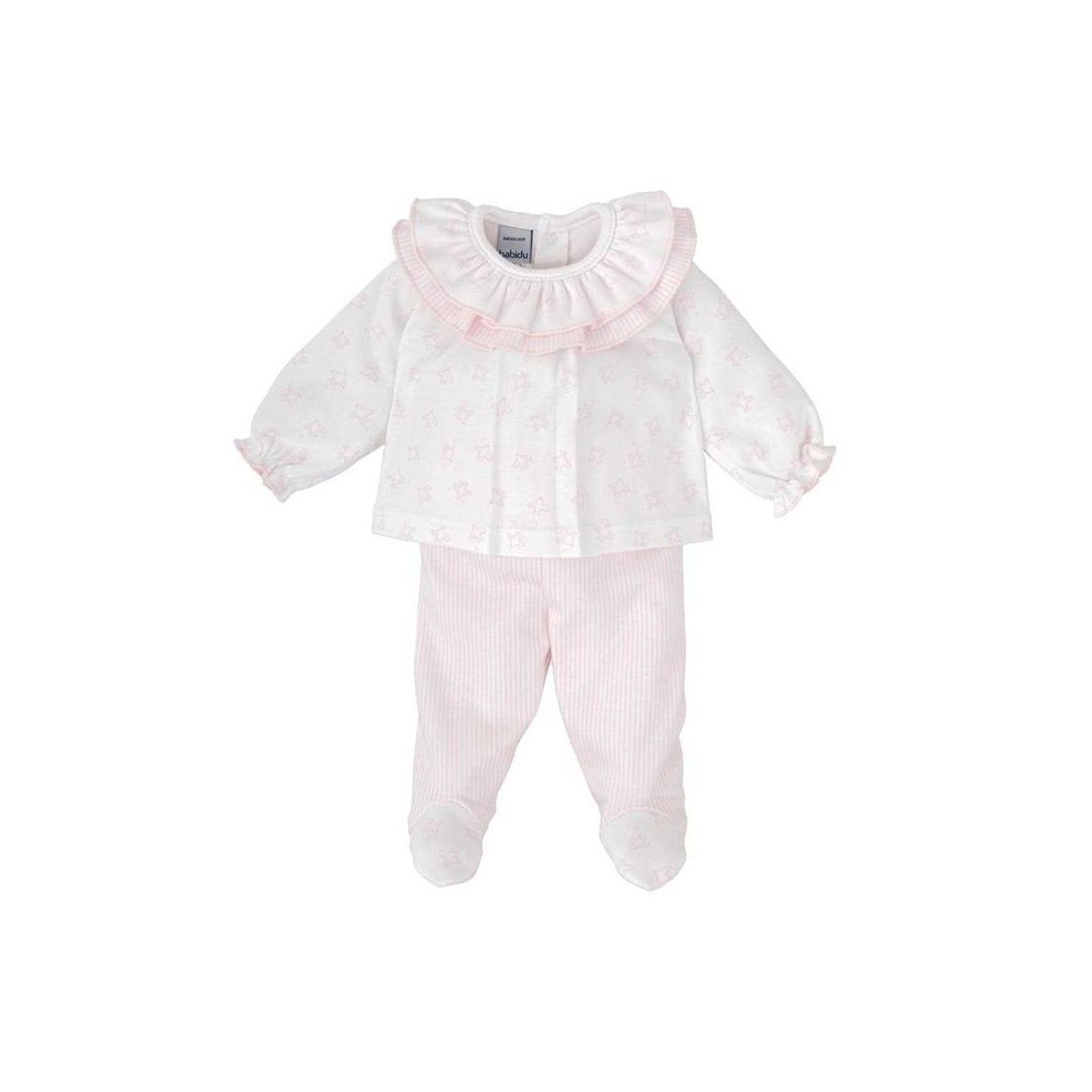 Conjunto de dos piezas para bebé niña es una combinación perfecta de ternura y elegancia. Confeccionado en algodón 100%, incluye una camiseta blanca de manga larga con un dulce estampado de pajaritos en rosa claro y un espectacular cuello volante con detalle de rayas. Las mangas fruncidas con lacitos aportan un acabado delicado. La polaina a rayas en tono rosa claro completa el conjunto con un look coordinado y encantador, ideal para los primeros meses del bebé.