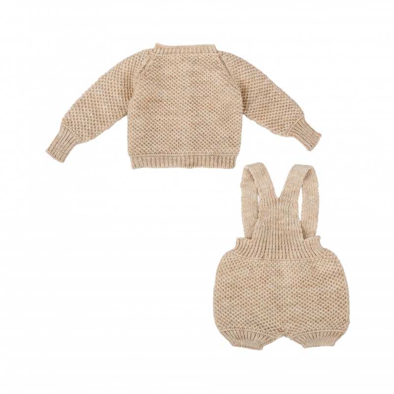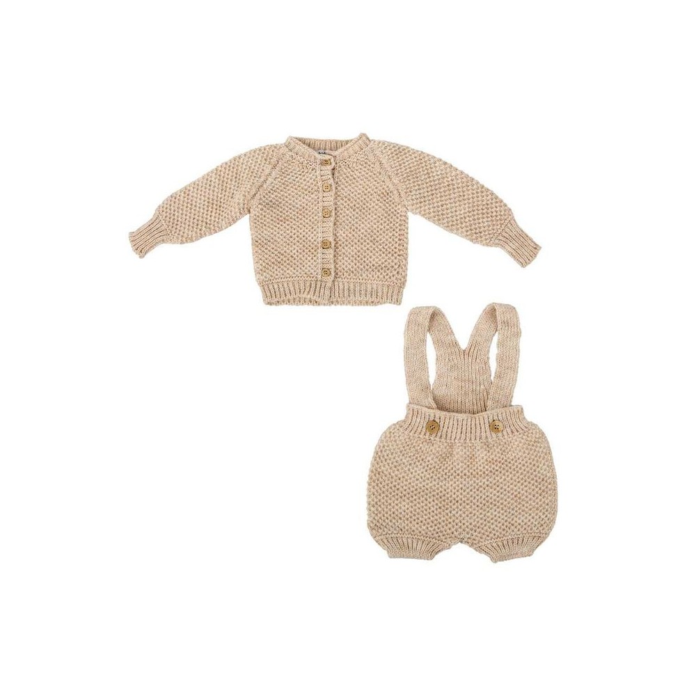 Conjunto de dos piezas para bebé confeccionado en punto beige con textura panal. La chaqueta, de manga larga y cierre delantero con botones de madera, aporta abrigo y practicidad. La ranita de tirantes a juego, ajustada en la cintura con botones, ofrece comodidad y un aire clásico y encantador. Un conjunto versátil y acogedor para los días más frescos.