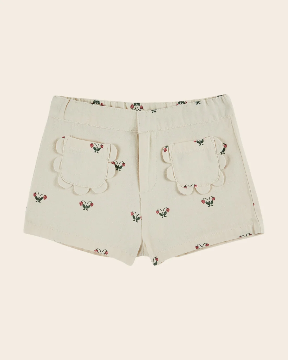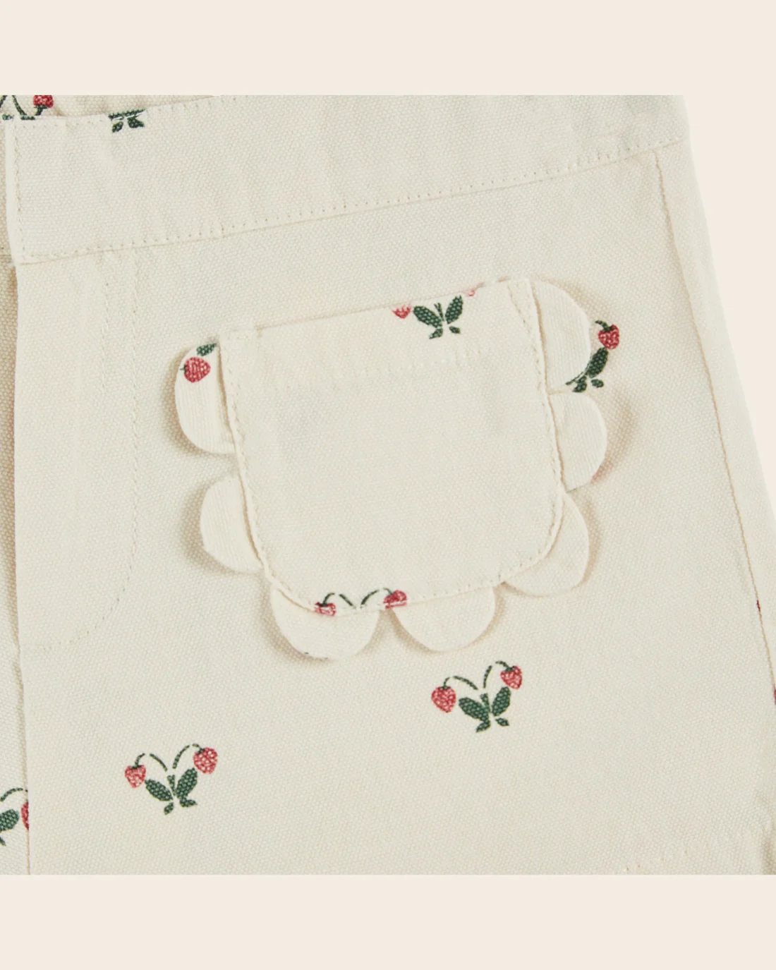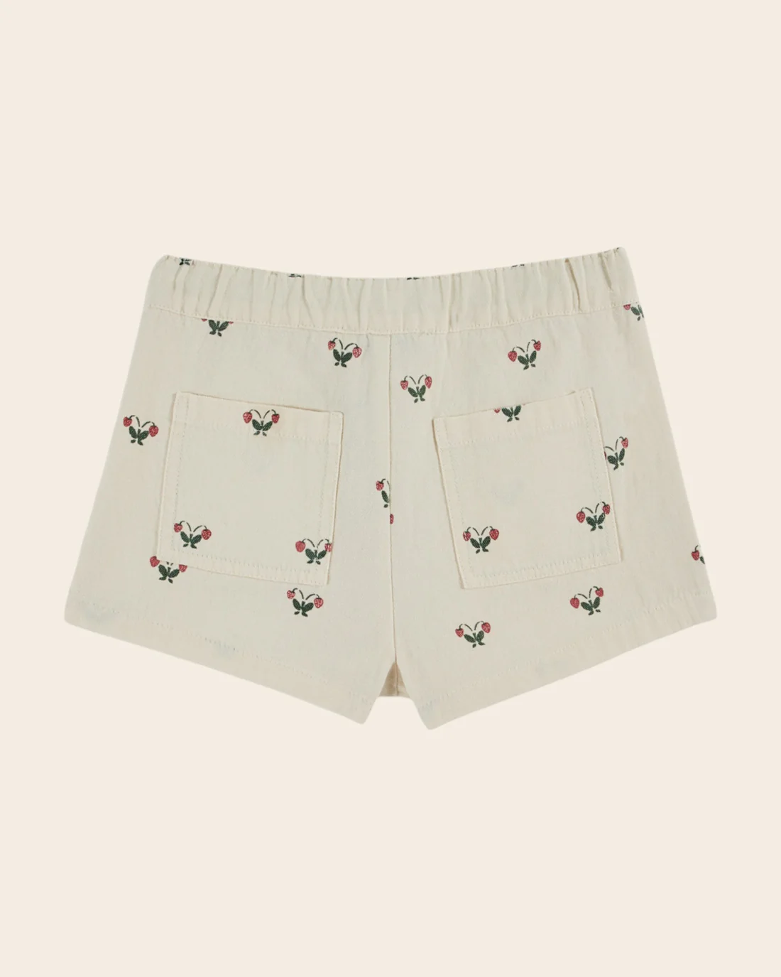 Pantalones cortos de lona de algodón color crema con estampado integral de plantas de fresa maduras.