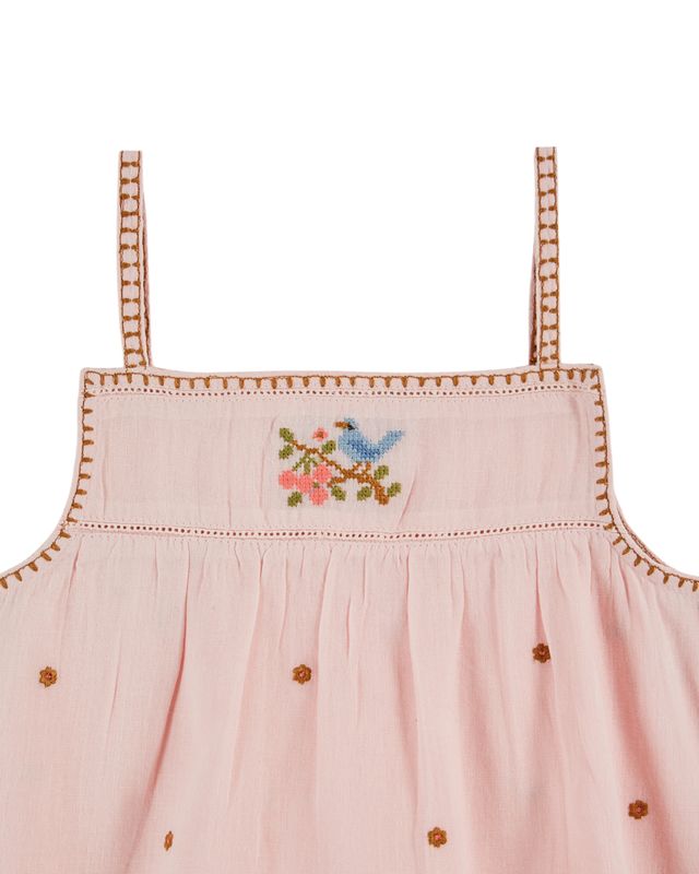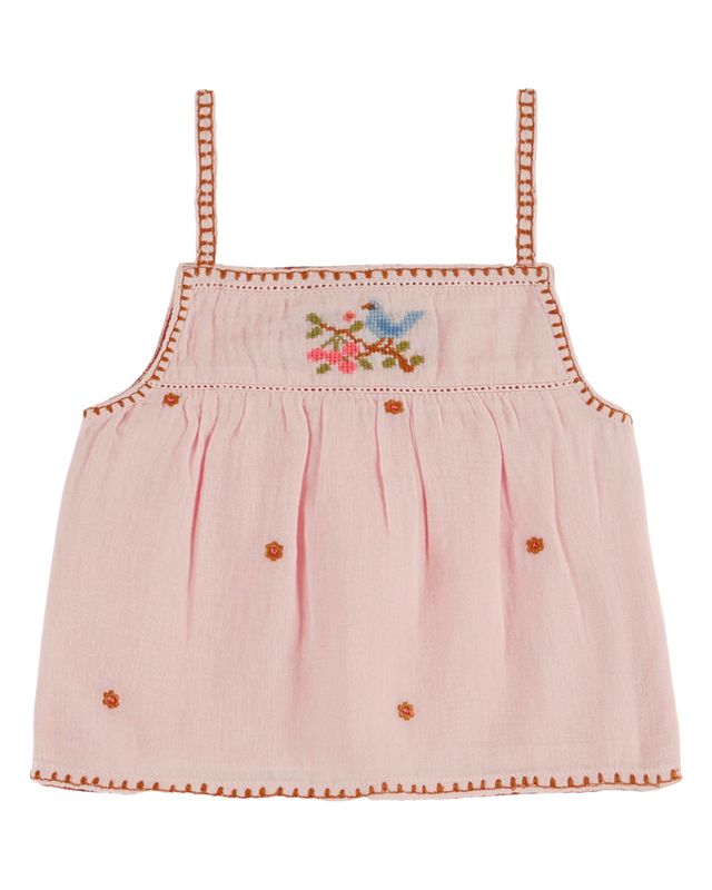 Top de tirantes de gasa de algodón rosa pastel bordado con pequeñas flores de ocre amarillo.