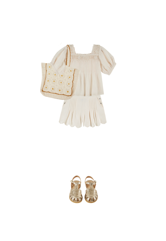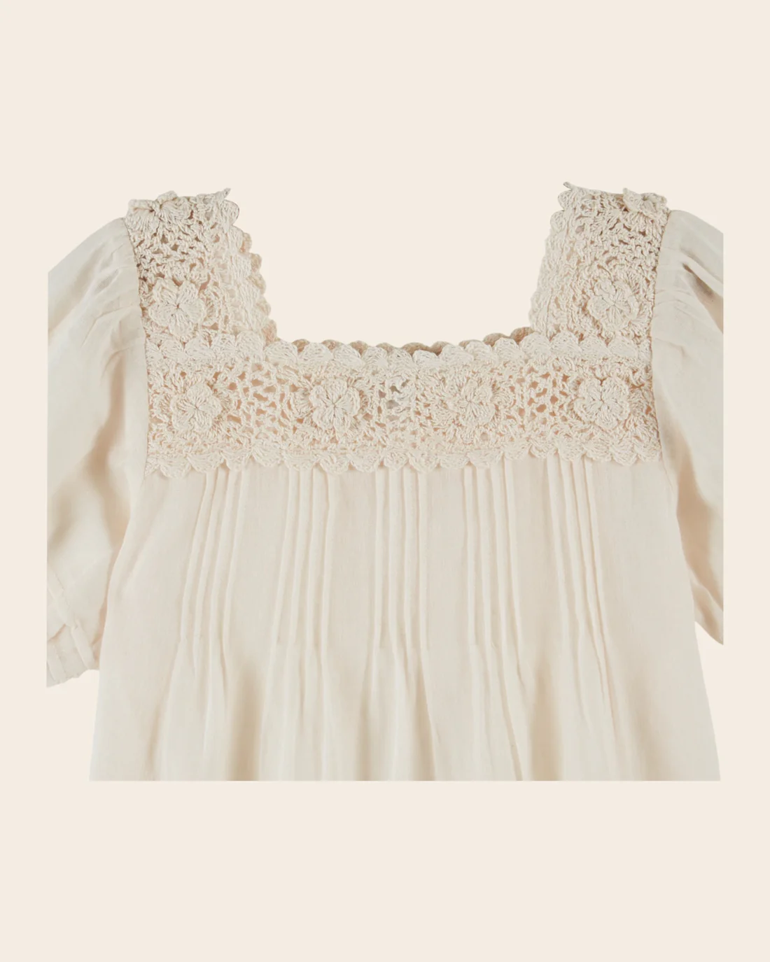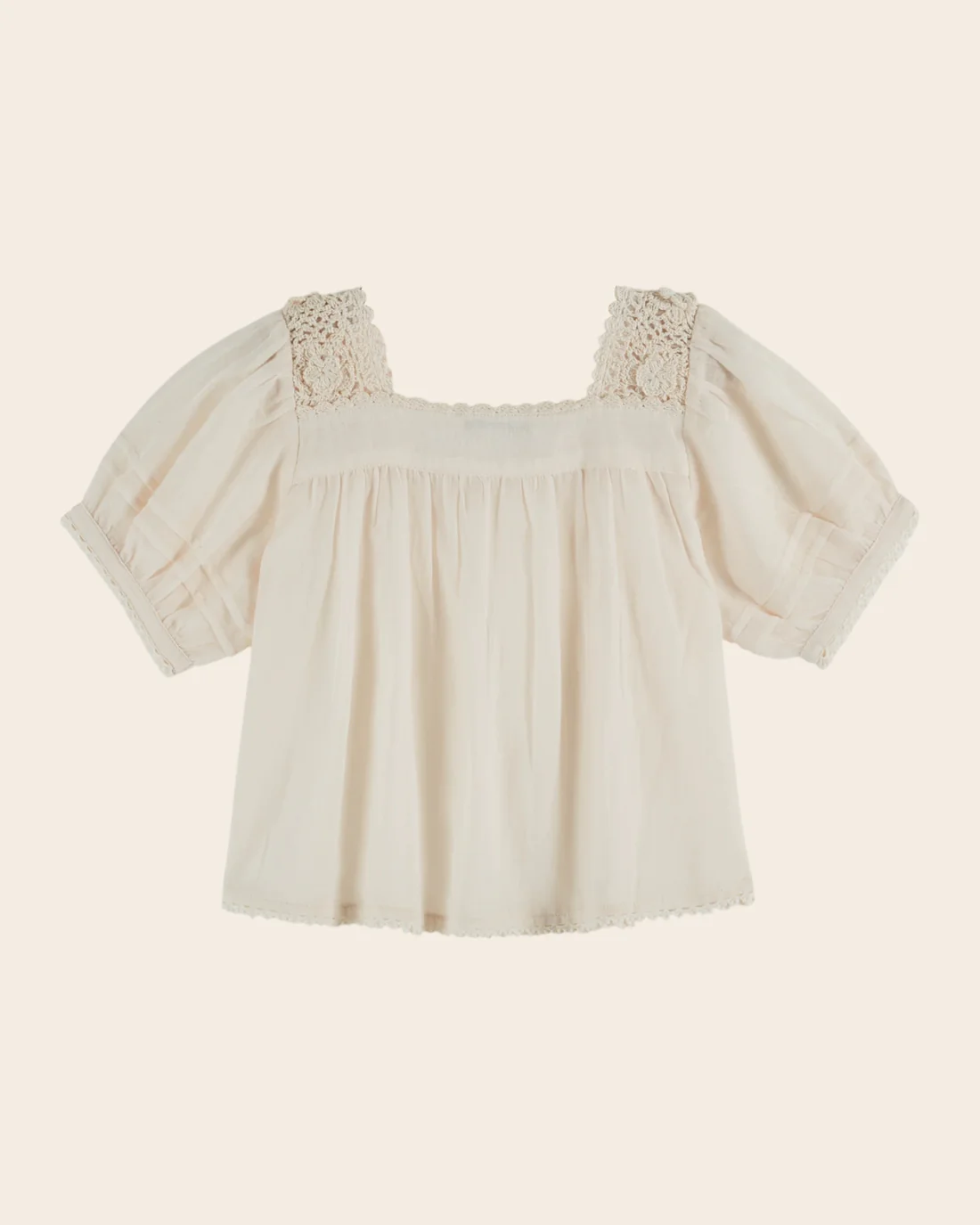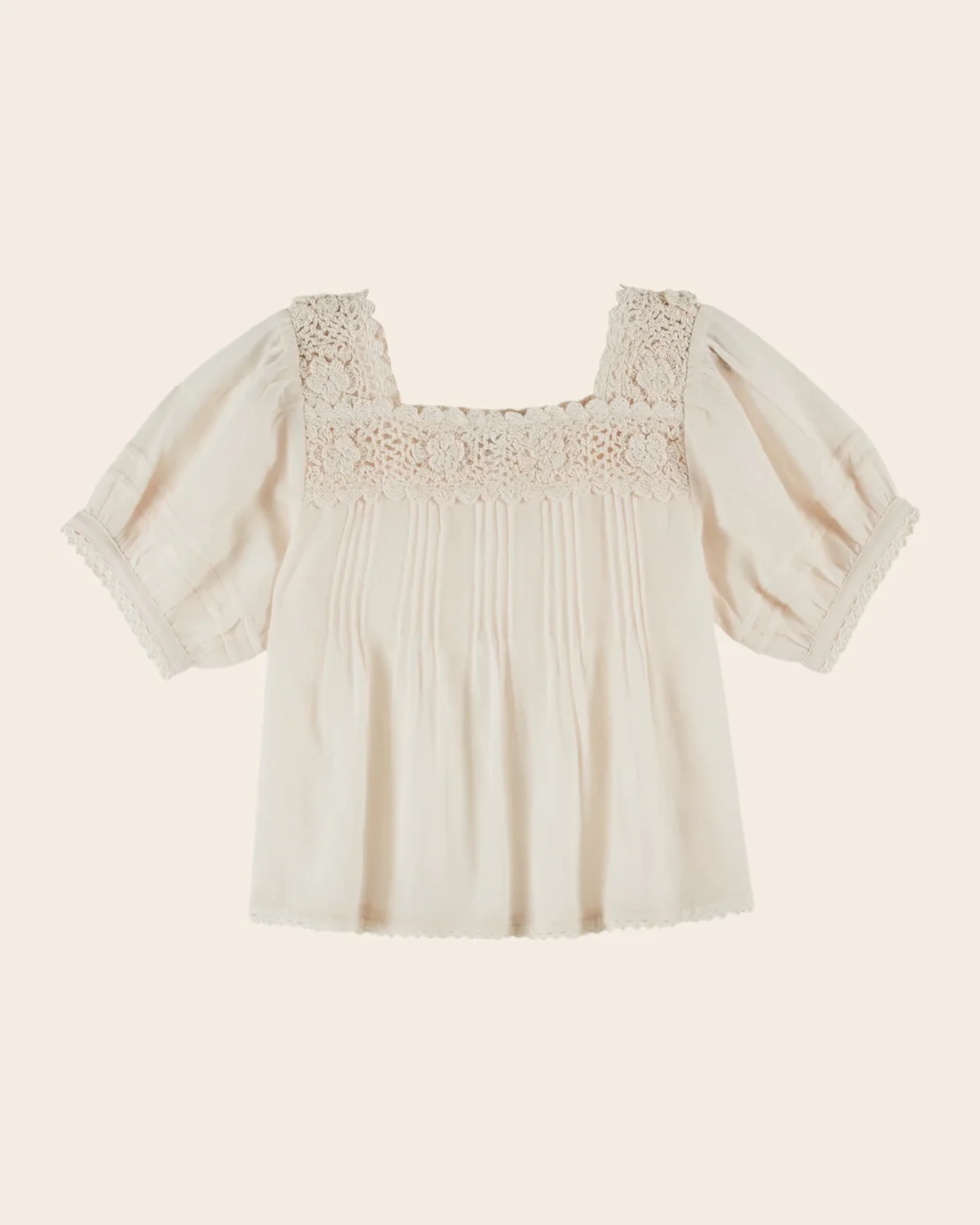 Blusa color crema de algodón orgánico. Su originalidad reside en los detalles de encaje tejidos a mano, el pespunte calado que realza los bordados y las bandas de pequeños pliegues planos.