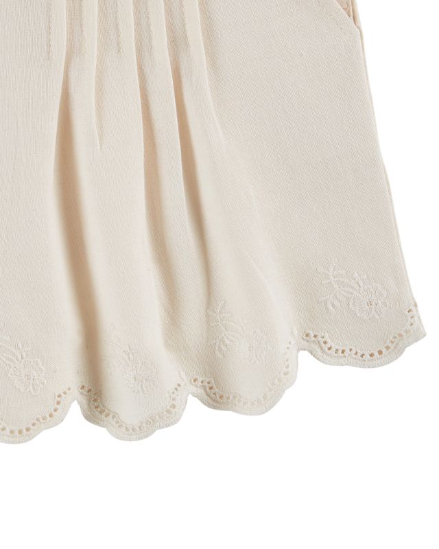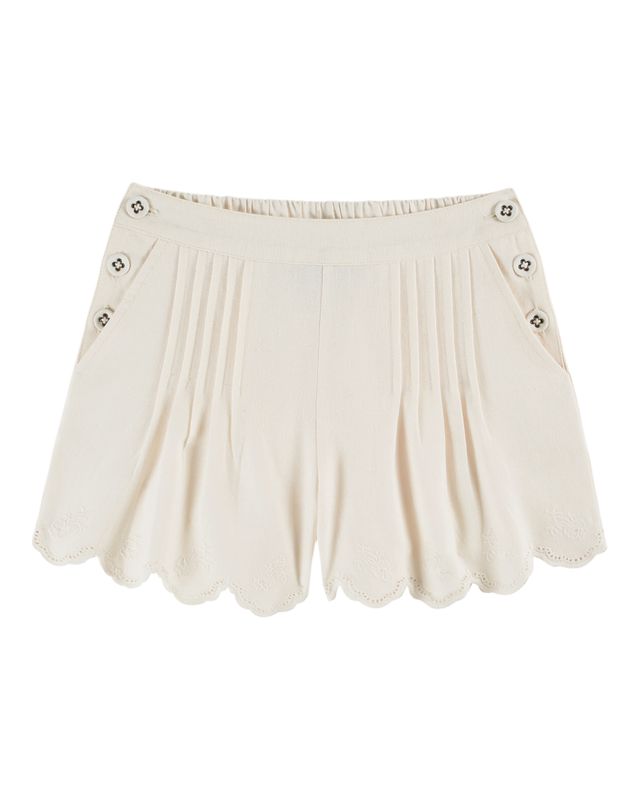 Pantalones cortos plisados ​​color crema. La mezcla de materiales crea una ligera textura rugosa, similar al lino.