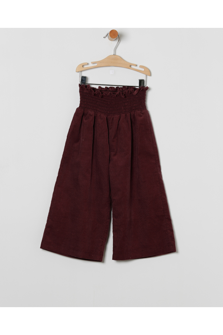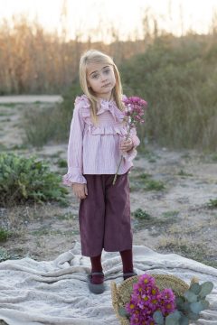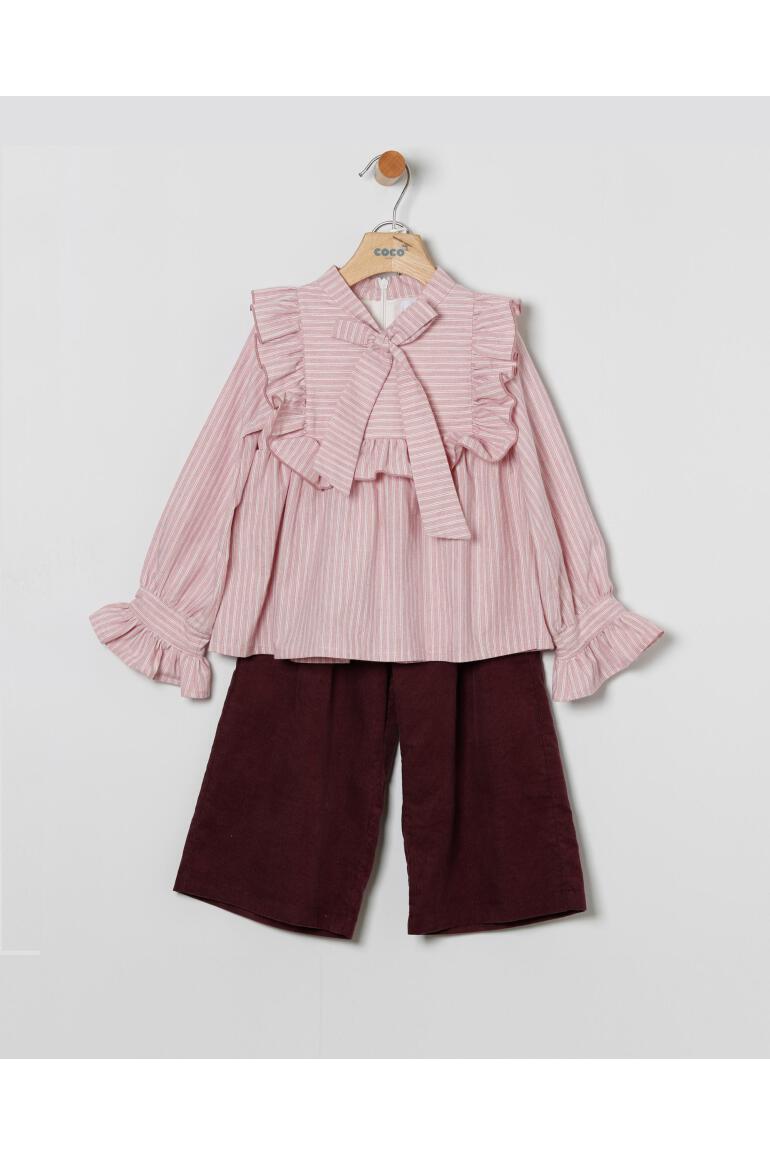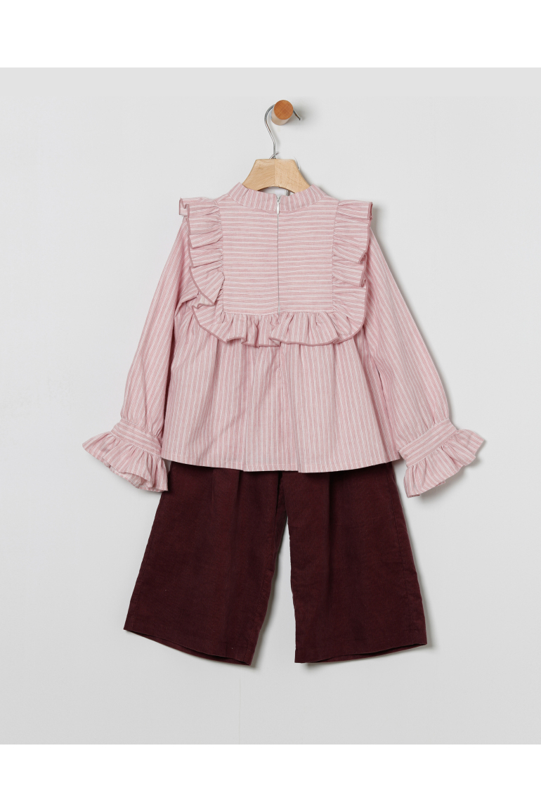 Conjunto de blusa en tejido de rayas en tonos rosa y blanco. Volantes en el pecho y detalle de lazo en el cuello, mas pantalon estilo palazzo en micropana color vino.