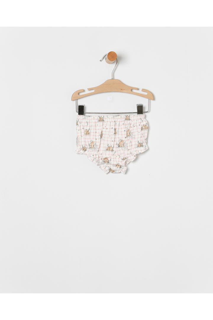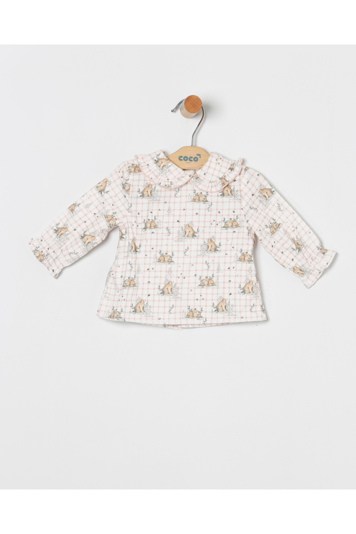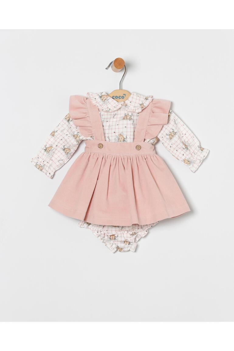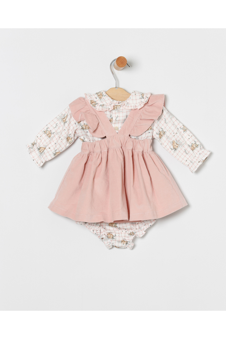 Conjunto de bebe, blusa en tejido estampado de cuadros y osistos, mas pichi con volantes en las mangas en tejido de micropana elástica en color rosa palo. Braguita en tejido de cuadros rosas y ositos.