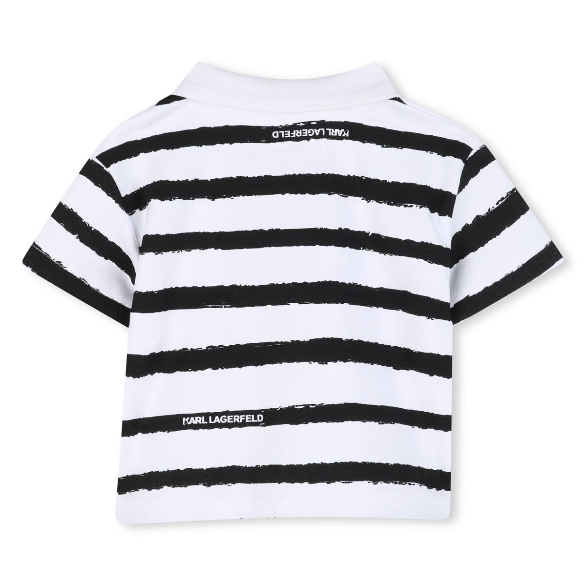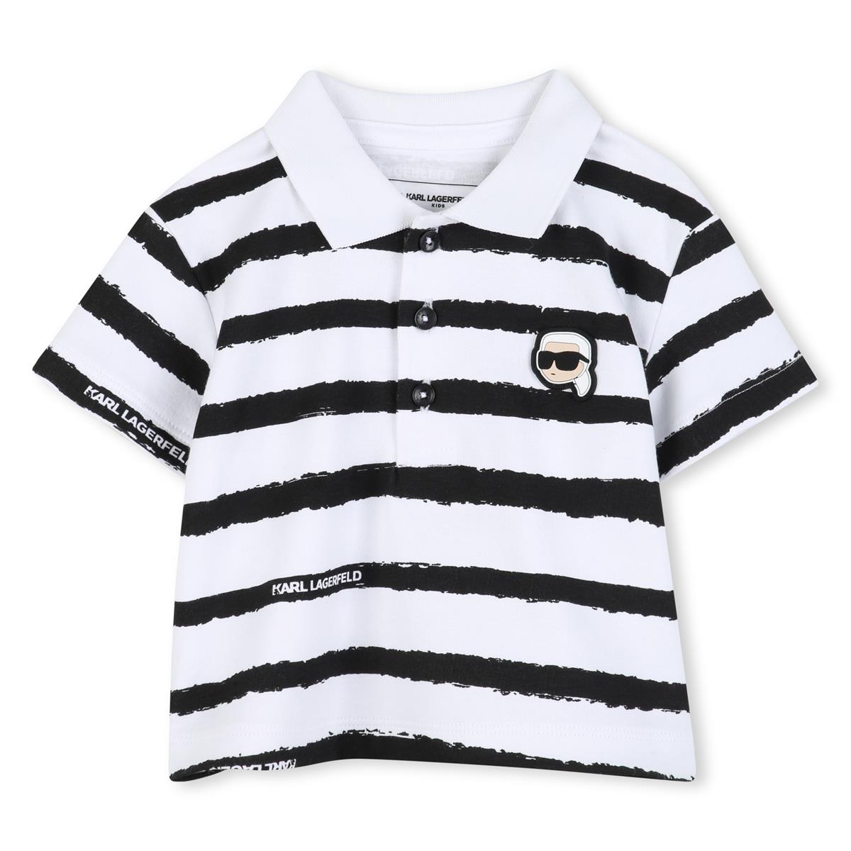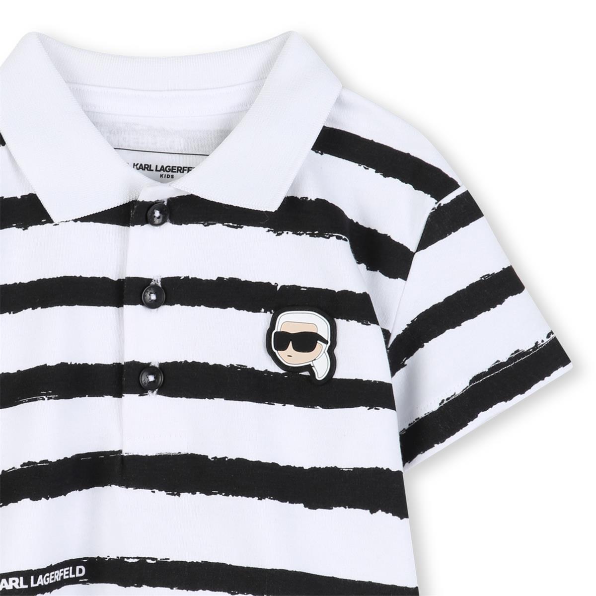 Conjunto de polo y pantalón corto. Polo de punto interlock 100% algodón de cultivo ecológico. Cuello de canalé. Solapa frontal con botones de la marca. Estampado de rayas con parche de silicona en la parte delantera. Pantalón corto de piqué de doble punto (60% algodón, 40% poliéster). Bolsillos laterales, cinturón de canalé con cintura elástica y cordones con el logo de KARL LAGERFELD.