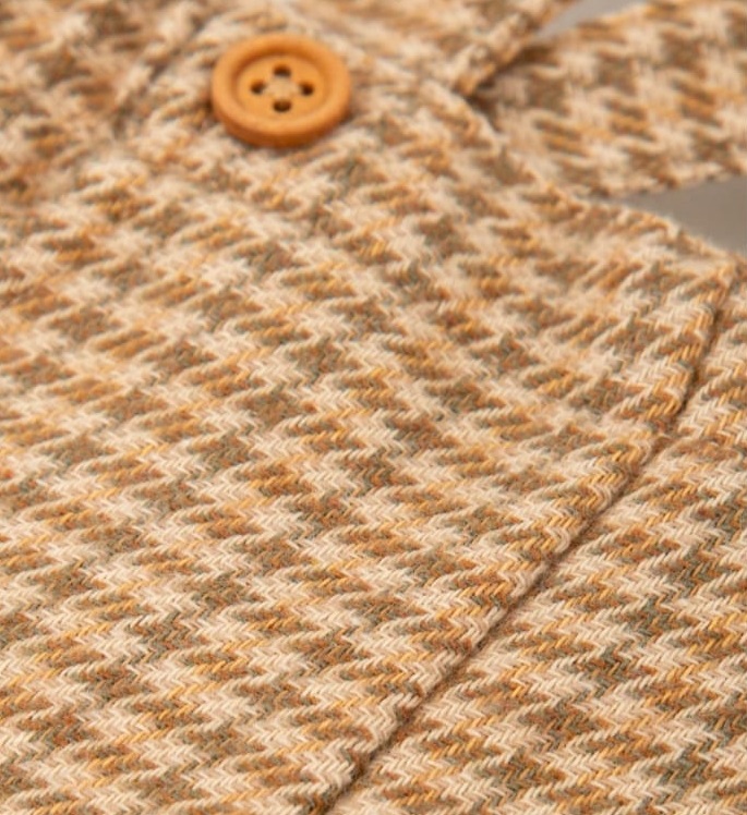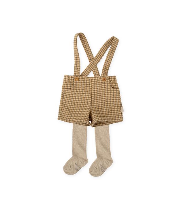 Bombacho de franela de cuadros con tirantes, bolsillos laterales y suave goma en la cintura. Combina con leotardos color arena.