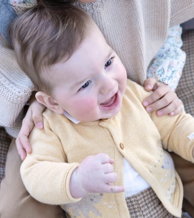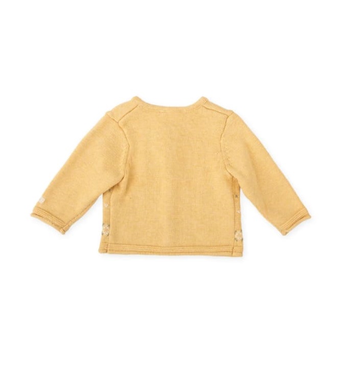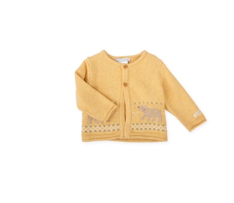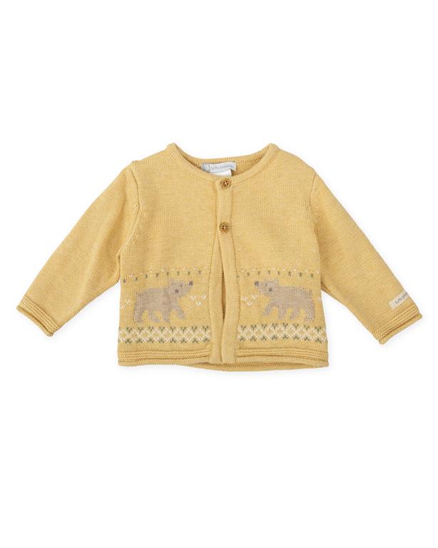 Chaqueta tricot en color mostaza, abertura delantera con dos botones de madera, decoración intarsia osos.