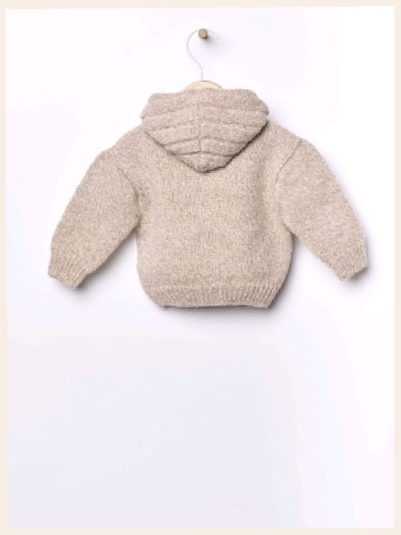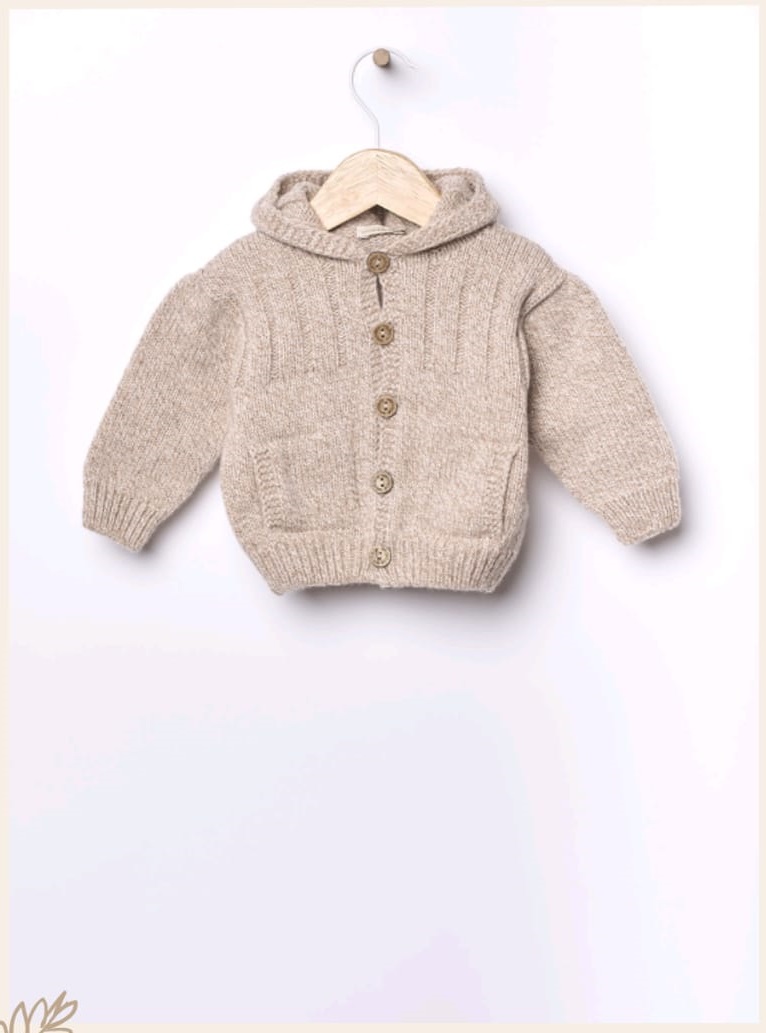 Cárdigan con capucha tejido en una preciosa lana merino extrafina, ideal para bebés. tiene dos bolsillos laterales y se cierra con botones de coco en la parte delantera.