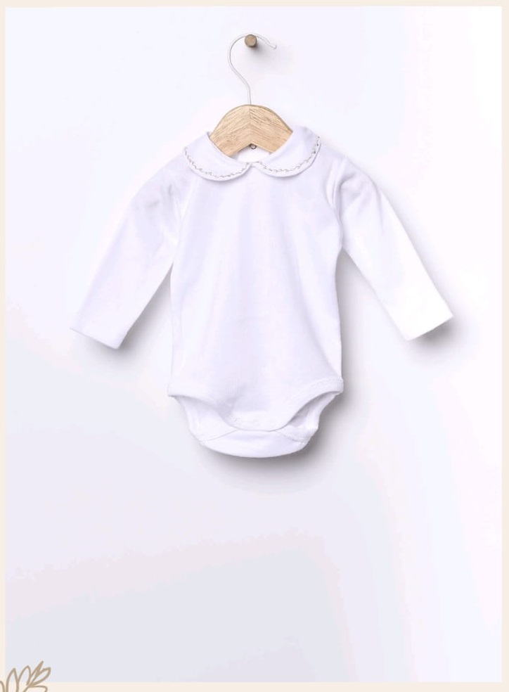Body clásico de manga larga, ideal para bebés. está confeccionado en punto de algodón ligero y tiene cuello redondo bordado. Se abrocha en la espalda y entre las piernas con botones automáticos.