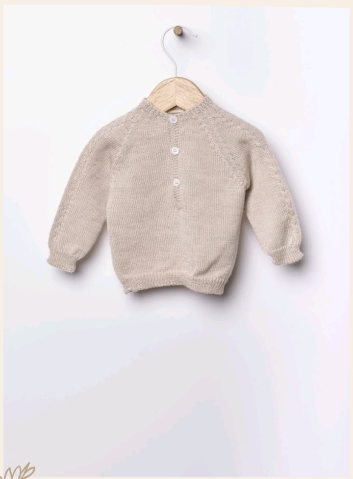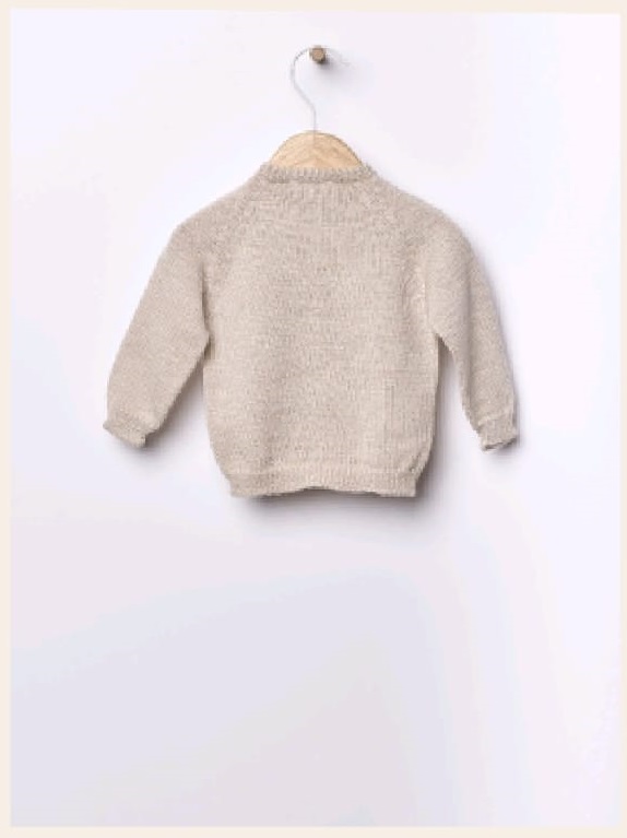 Suéter tejido en una preciosa lana merino, ideal para bebés. El suéter de manga larga se abrocha por delante con botones de nácar, esta prenda no tiene costuras para la máxima comodidad de tu bebé.