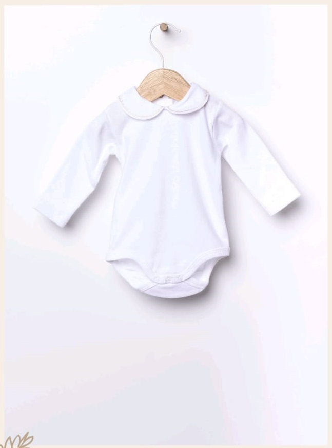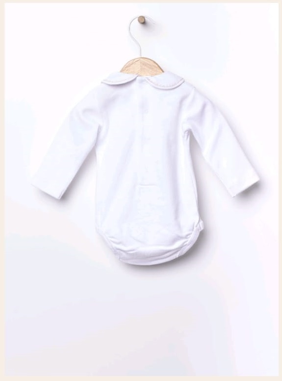 Body clásico de manga larga, ideal para bebés, de manga larga y cuello redondo está confeccionado en punto de algodón ligero y tiene cuello redondo bordado. Se abrocha en la espalda y entre las piernas con botones automáticos.