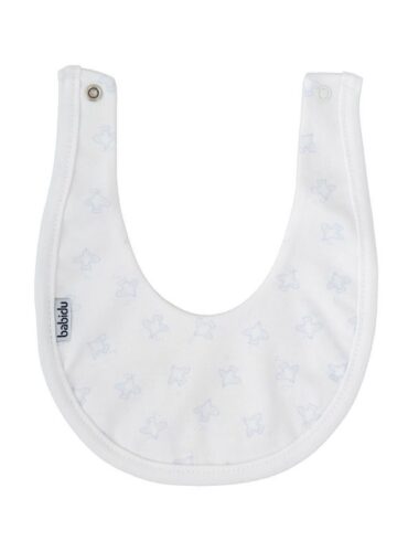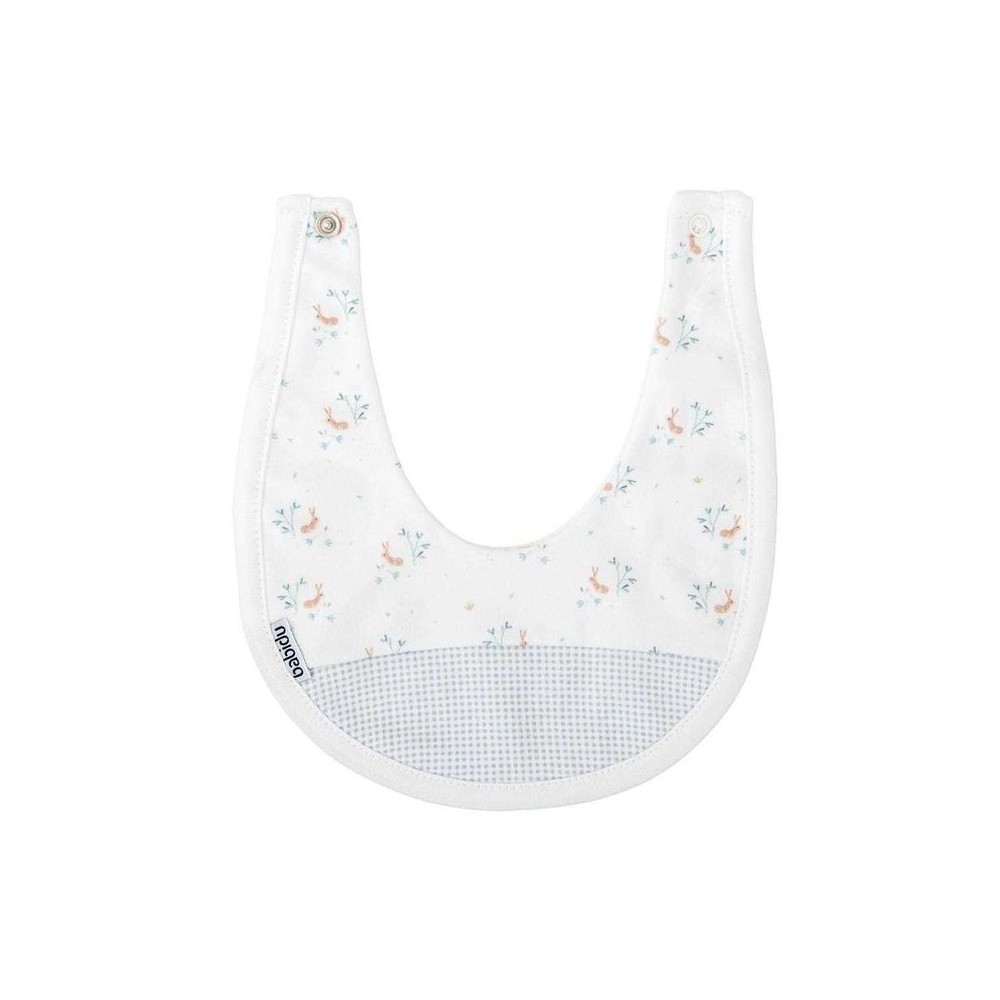 Este babero es el complemento ideal para proteger la ropita del bebé sin renunciar al estilo. Confeccionado en suave algodón, presenta un delicado estampado floral en tonos pastel sobre fondo blanco, coordinado con una franja inferior en tejido de cuadros vichy celeste que le da un acabado clásico y armonioso.