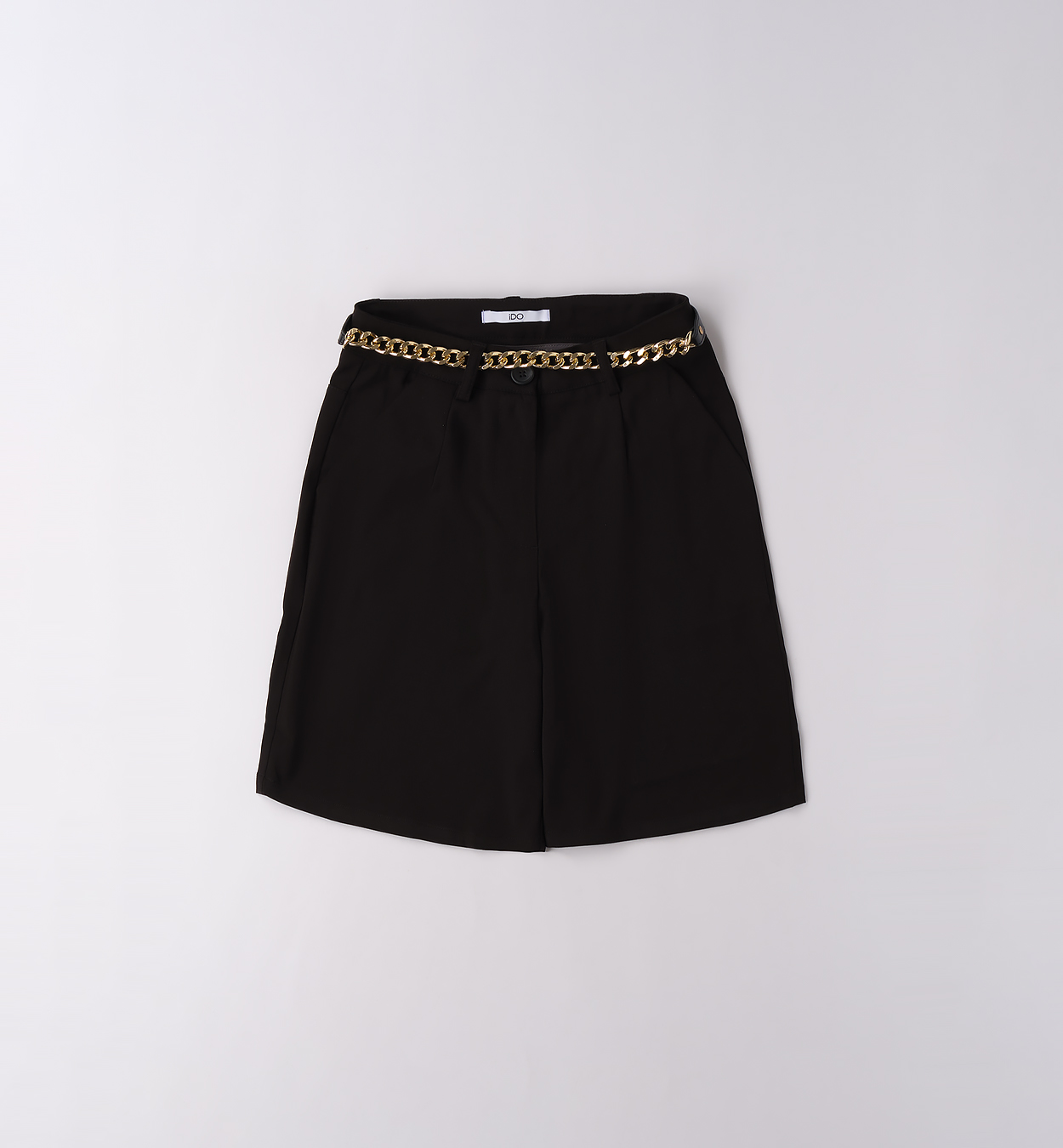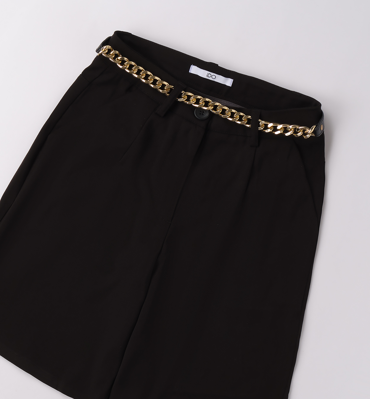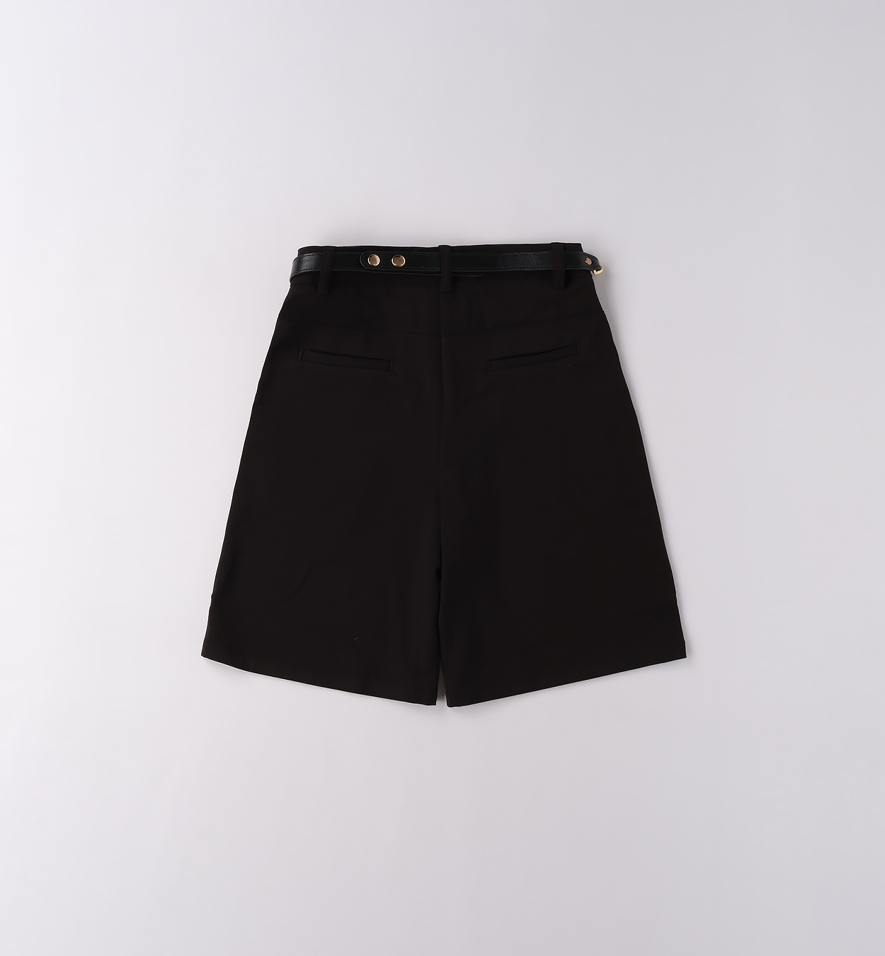 Pantalones cortos de sarga elástica. Cierre de cremallera y botón. Cintura ajustable con elástico interior para ojales. Incluye cinturón dorado a juego.