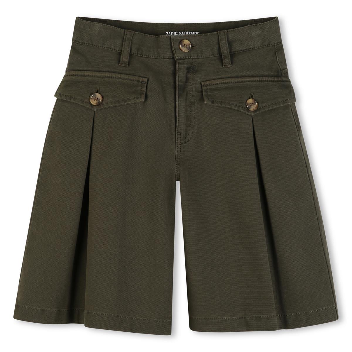Bermudas con bolsillos delanteros con solapa, pliegues debajo de cada bolsillo y bordado en el bolsillo trasero. 100% Algodón.