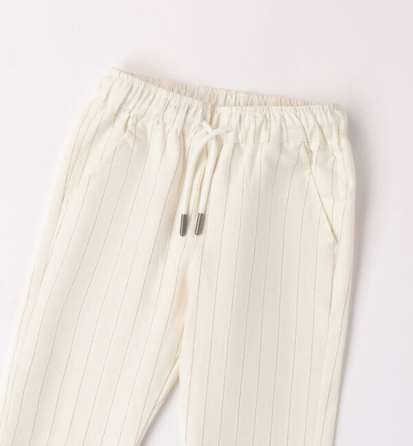 Pantalón de lino elástico y viscosa. El modelo presenta bolsillos tipo chino en la parte delantera y bolsillos de ribete en la parte trasera, y cintura elástica con cordón. Ajuste holgado. Los pantalones tienen un estampado de rayas y el cordón es tono sobre tono.