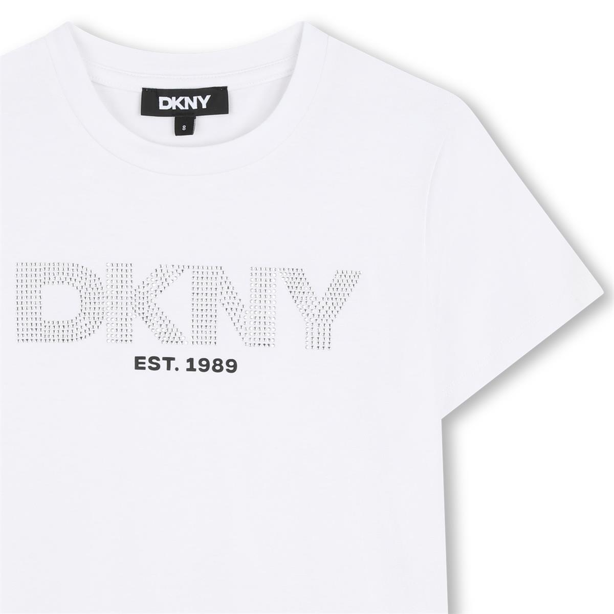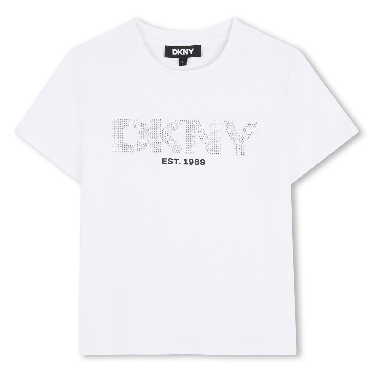 Camiseta de manga corta de punto, 95% viscosa, 5% elastano. Logotipo de DKNY en la parte delantera que combina estampado y pedrería.