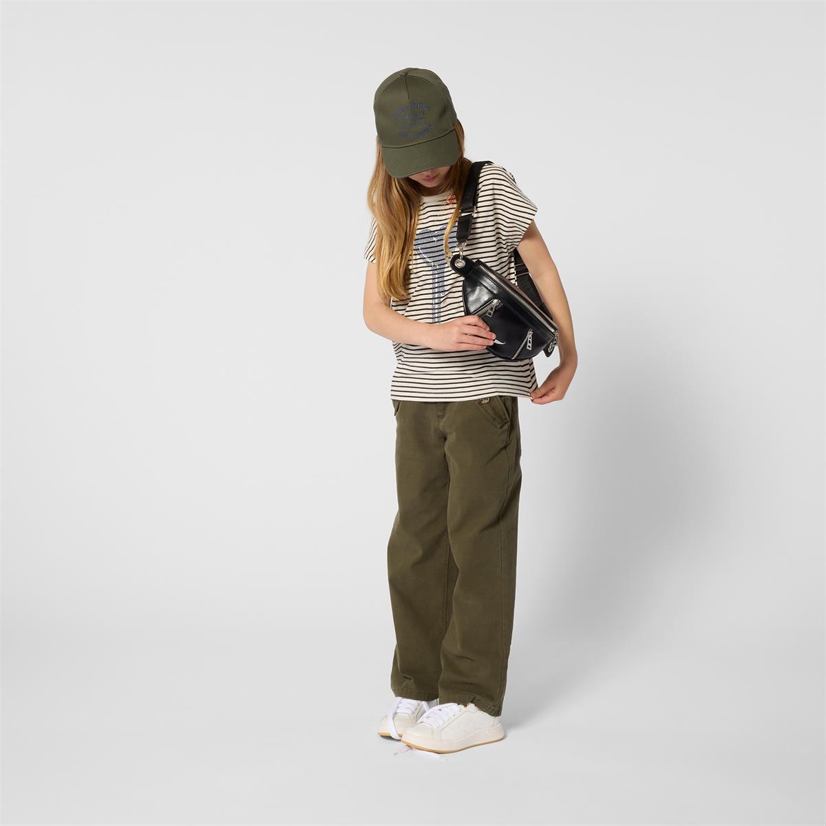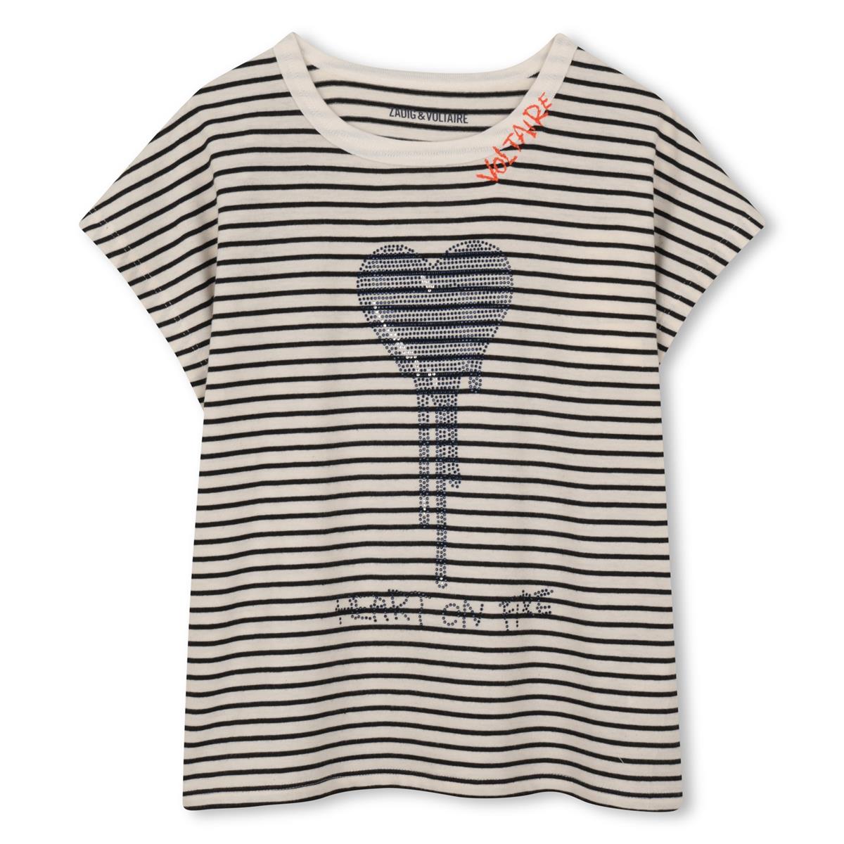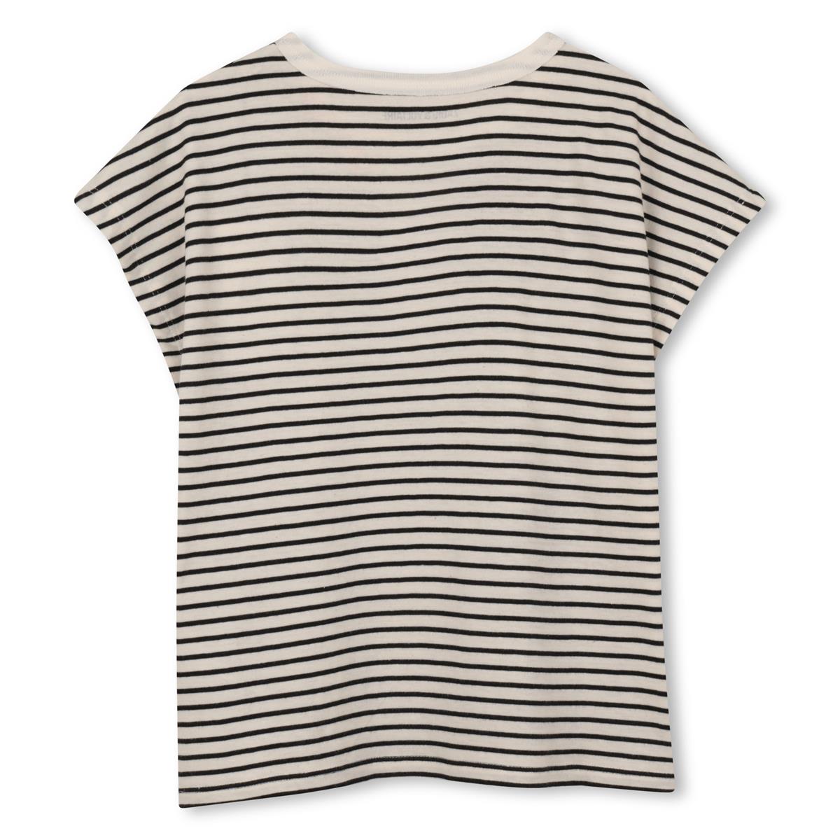 Camiseta oversize de rayas con cuello redondo. Diseño de pedrería en la parte delantera y bordado en el escote. 100 % algodón.