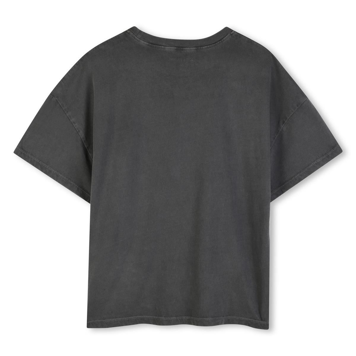 Camiseta oversize de cuello redondo con estampado frontal multicolor. Tratamiento de teñido en prenda. 100 % algodón orgánico.