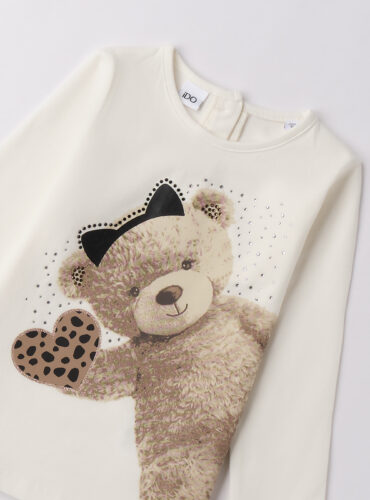Camiseta, confeccionada en interlock 100 % algodón. Decorada con pedrería, purpurina, lazo y apliques.