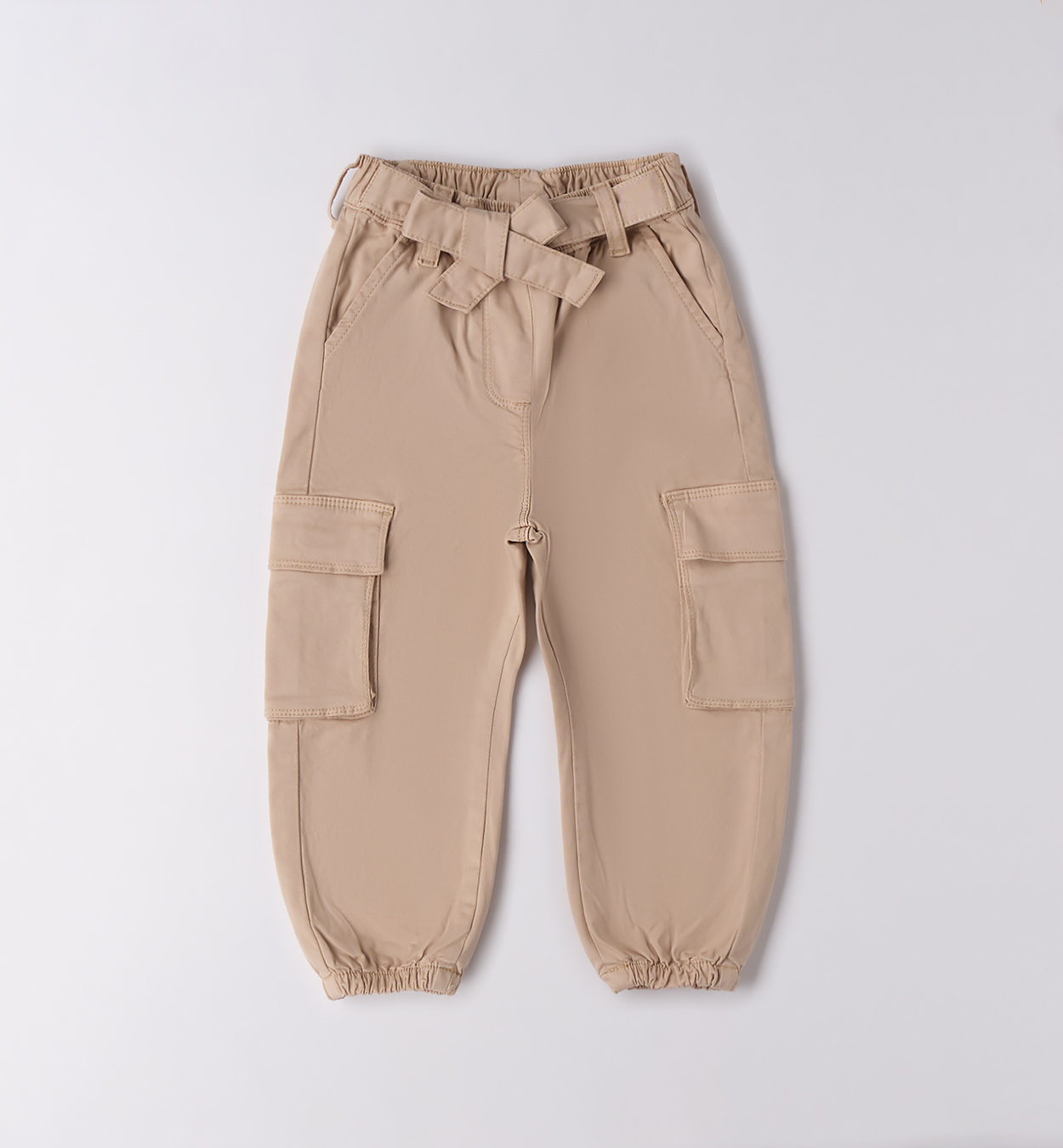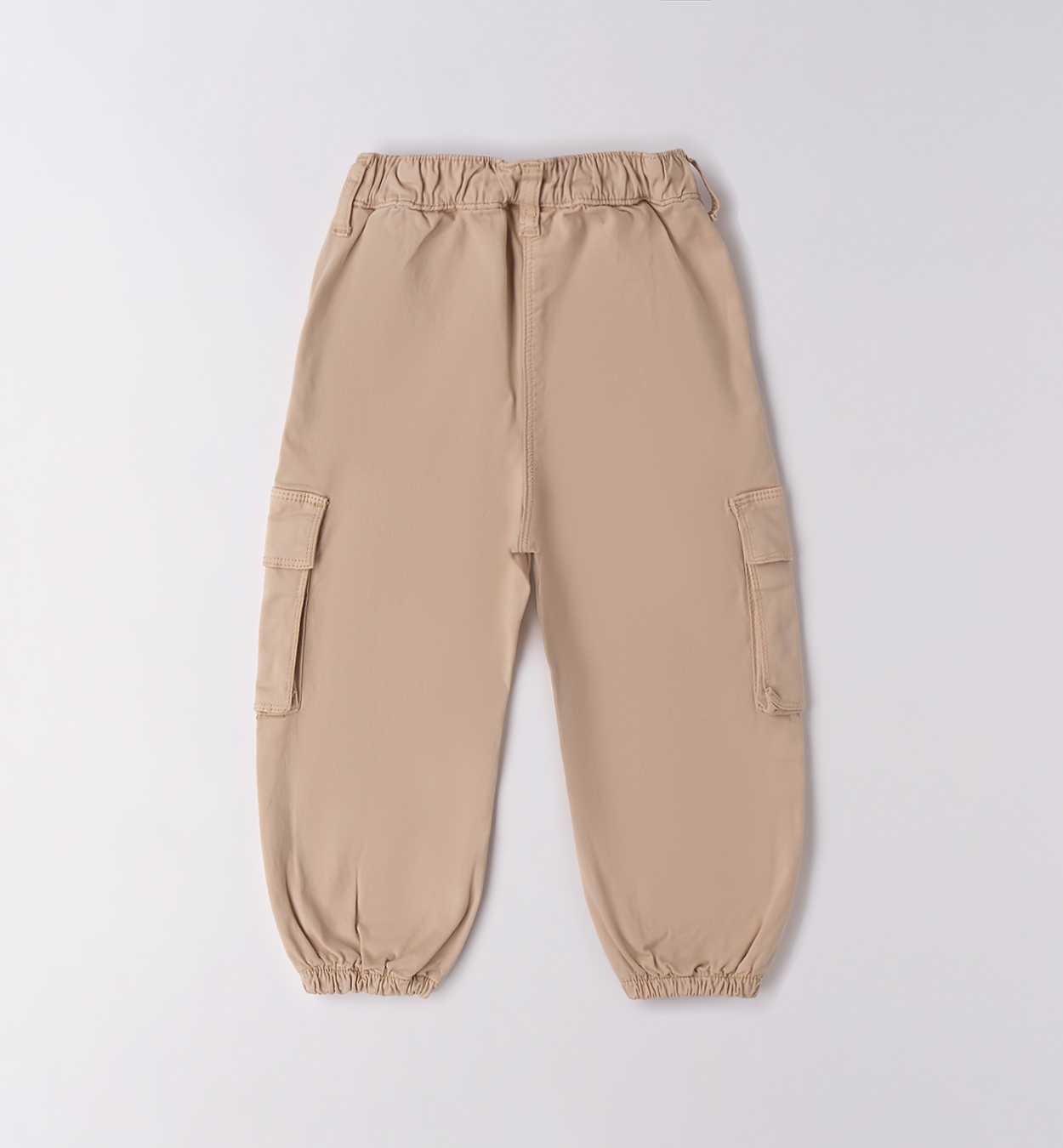 Pantalones, confeccionados en sarga de algodón elástico con tacto melocotón. Cintura, puños y bolsillos laterales de parche elásticos.