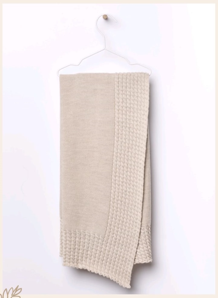 La manta, tejida suavemente en lana merino, es ideal para acurrucar a tu bebé, esta pieza no tiene costuras para la máxima comodidad de tu bebé. 100 cm x 70 cm.