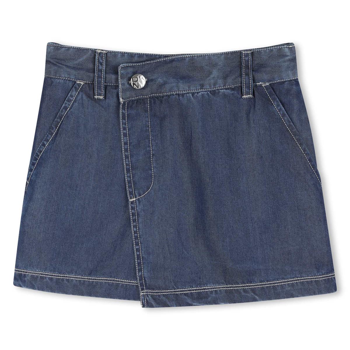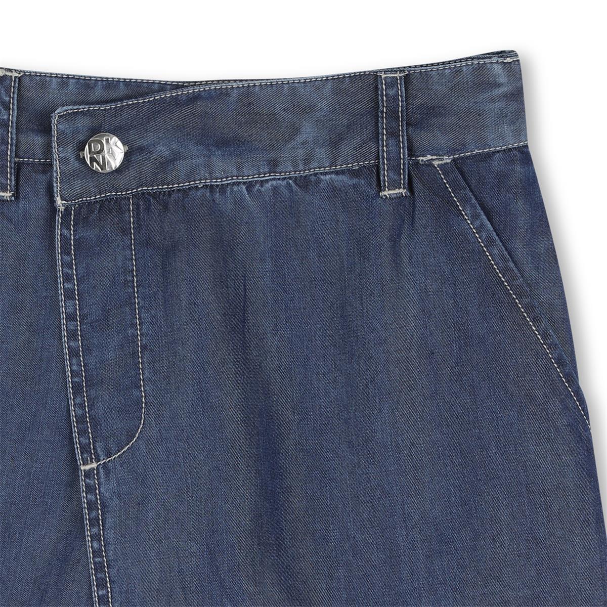 Falda pantalón, cierre de cremallera lateral, botón frontal, dos bolsillos delanteros y dos bolsillos traseros. Bordado plateado de DKNY en el bolsillo trasero.