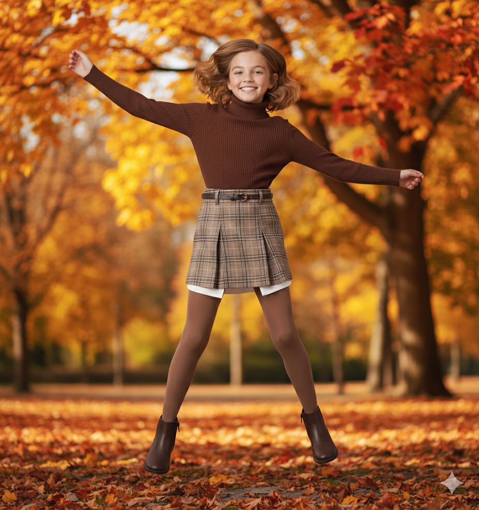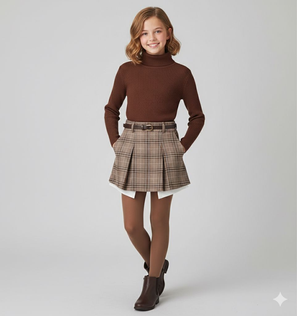 Falda para niña, confeccionada en sarga con forro de algodón. Cintura ajustable con elástico interior con ojal. Cierre con cremallera invisible. Cinturón a juego.