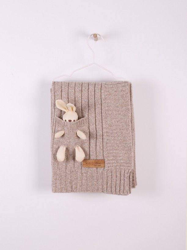Manta, tejida con suave lana merino extrafina, ideal para acurrucar a tu bebé. La manta está tejida con un adorable bolsillo que lleva un adorable conejito.  70 x 100 cm.