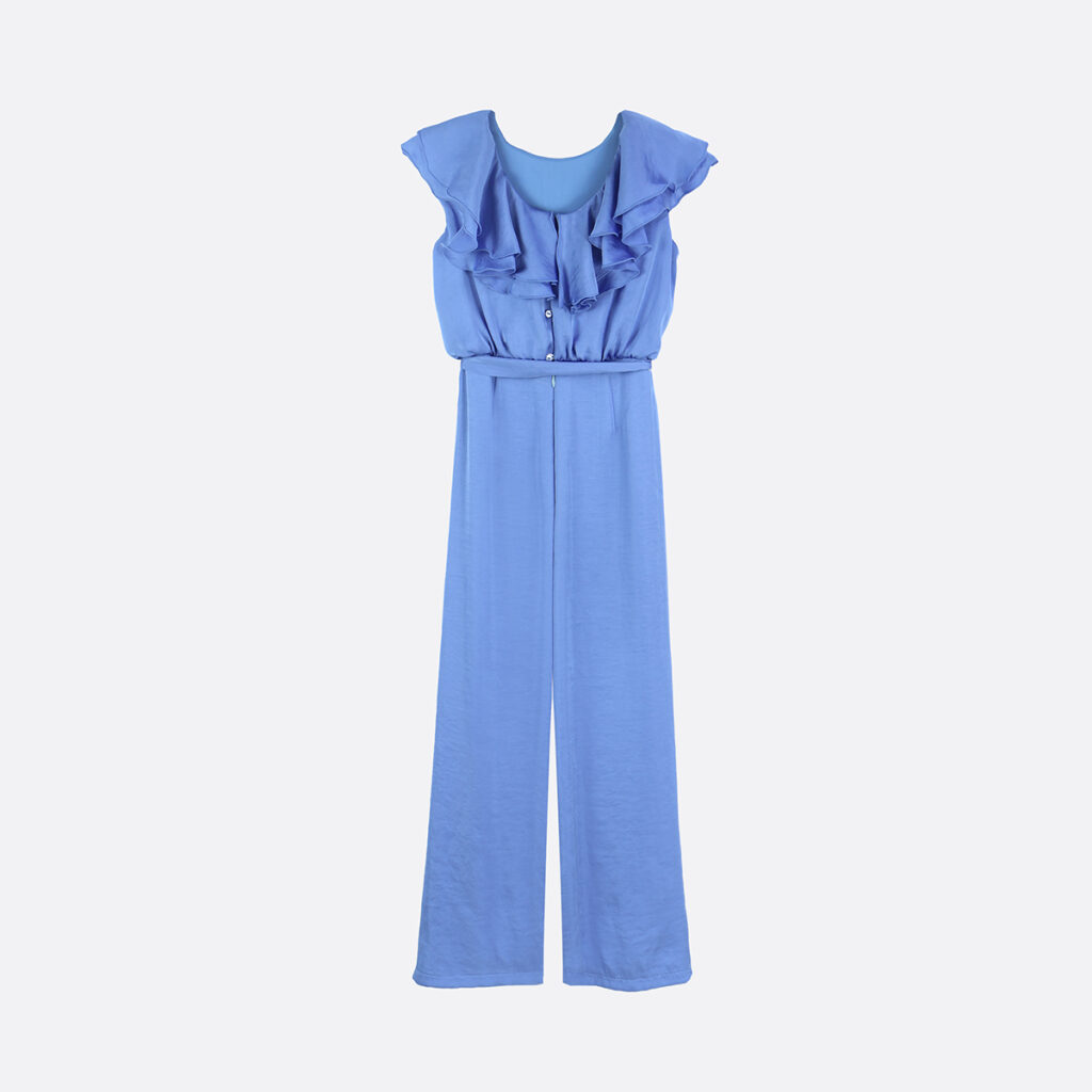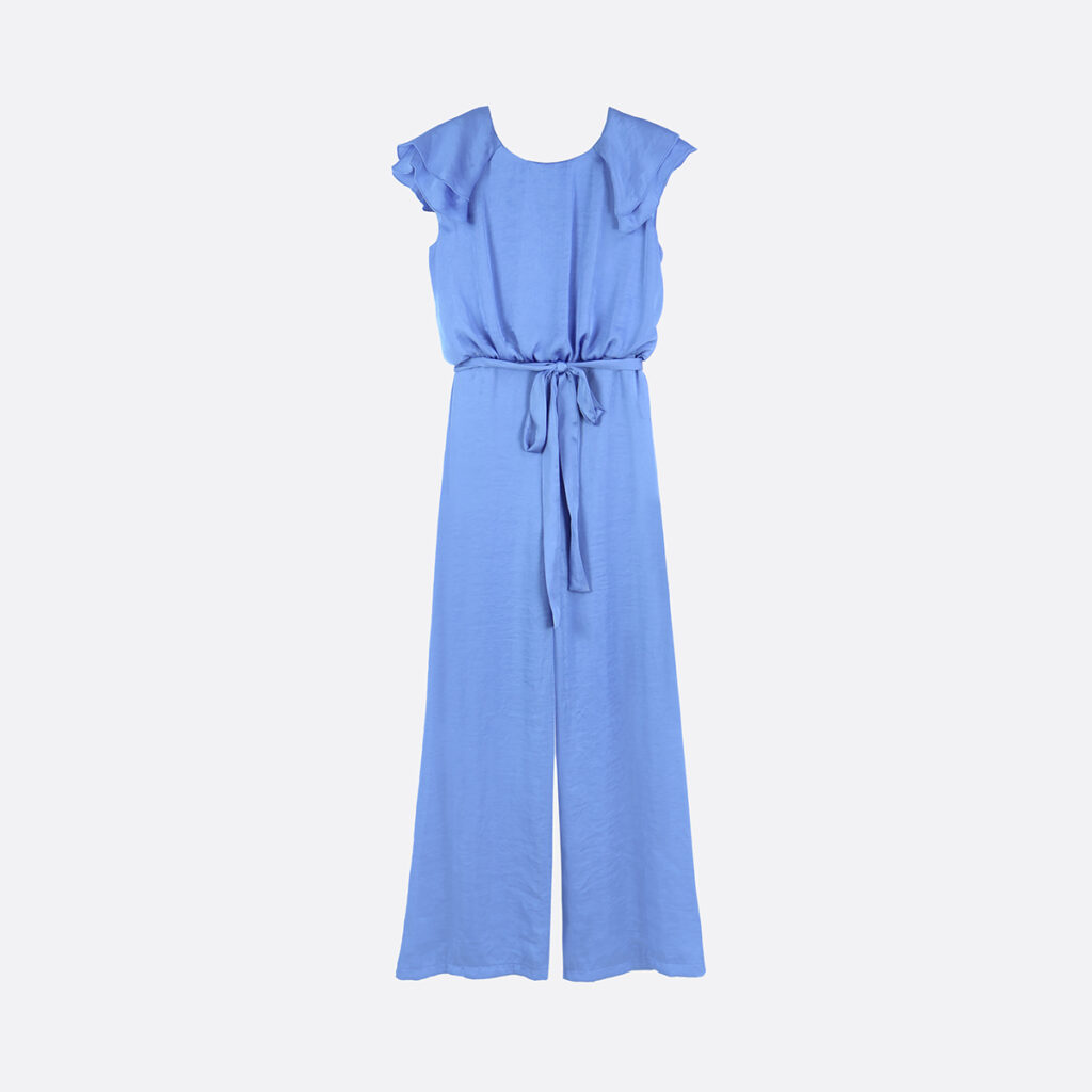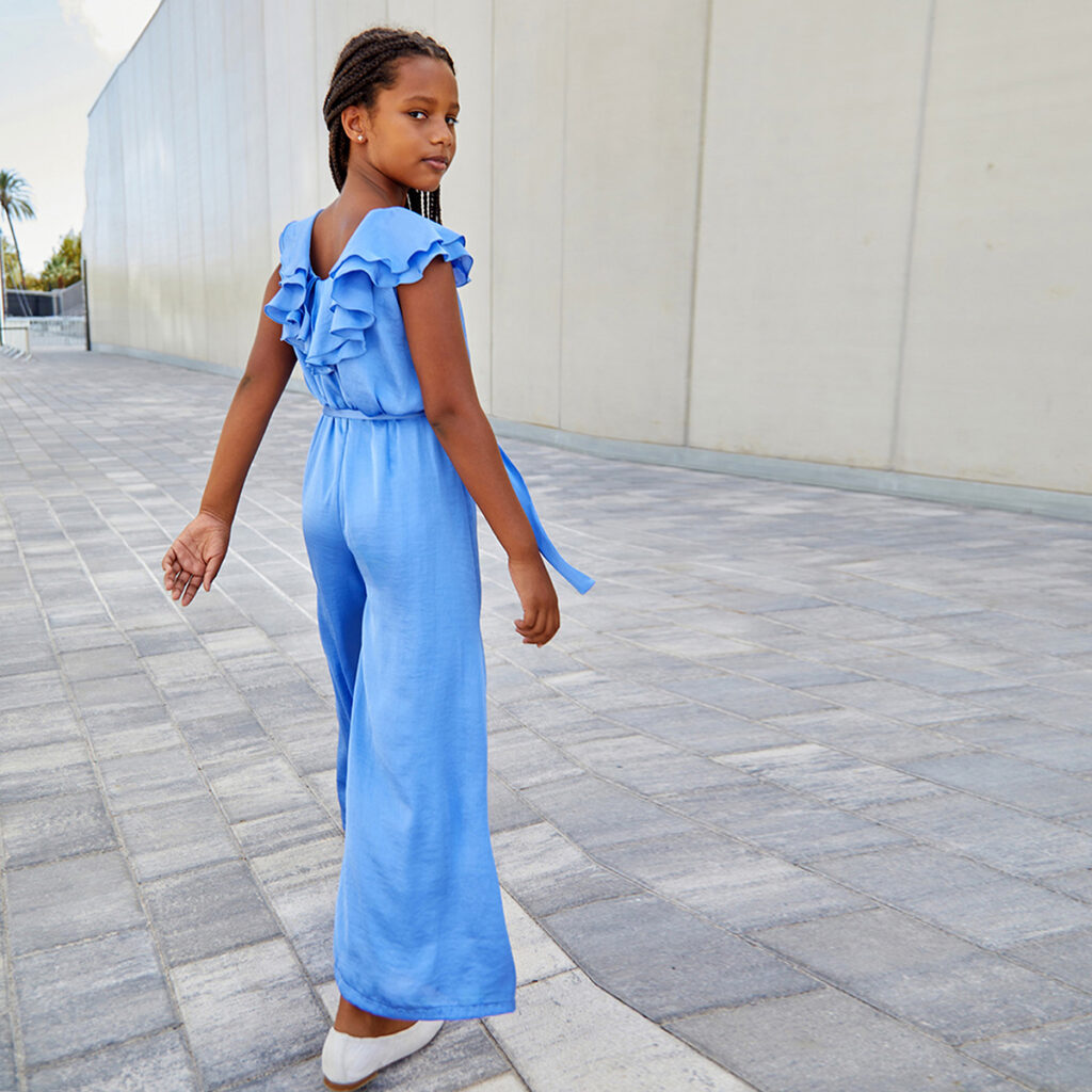 Mono junior en crepe sedoso azul intenso con mangas en cascada, escote en la espalda y cinturón lazado del mismo tejido.