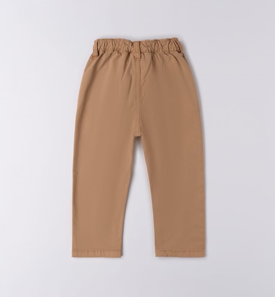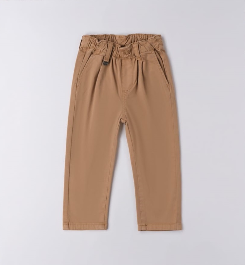 Pantalones, confeccionados en sarga elástica con tacto melocotón. Bragueta sintética. Corte holgado. Cintura ajustable con elástico interno para ojales.