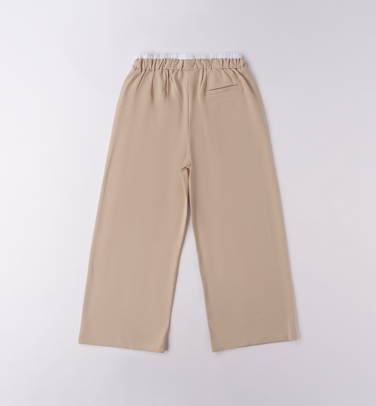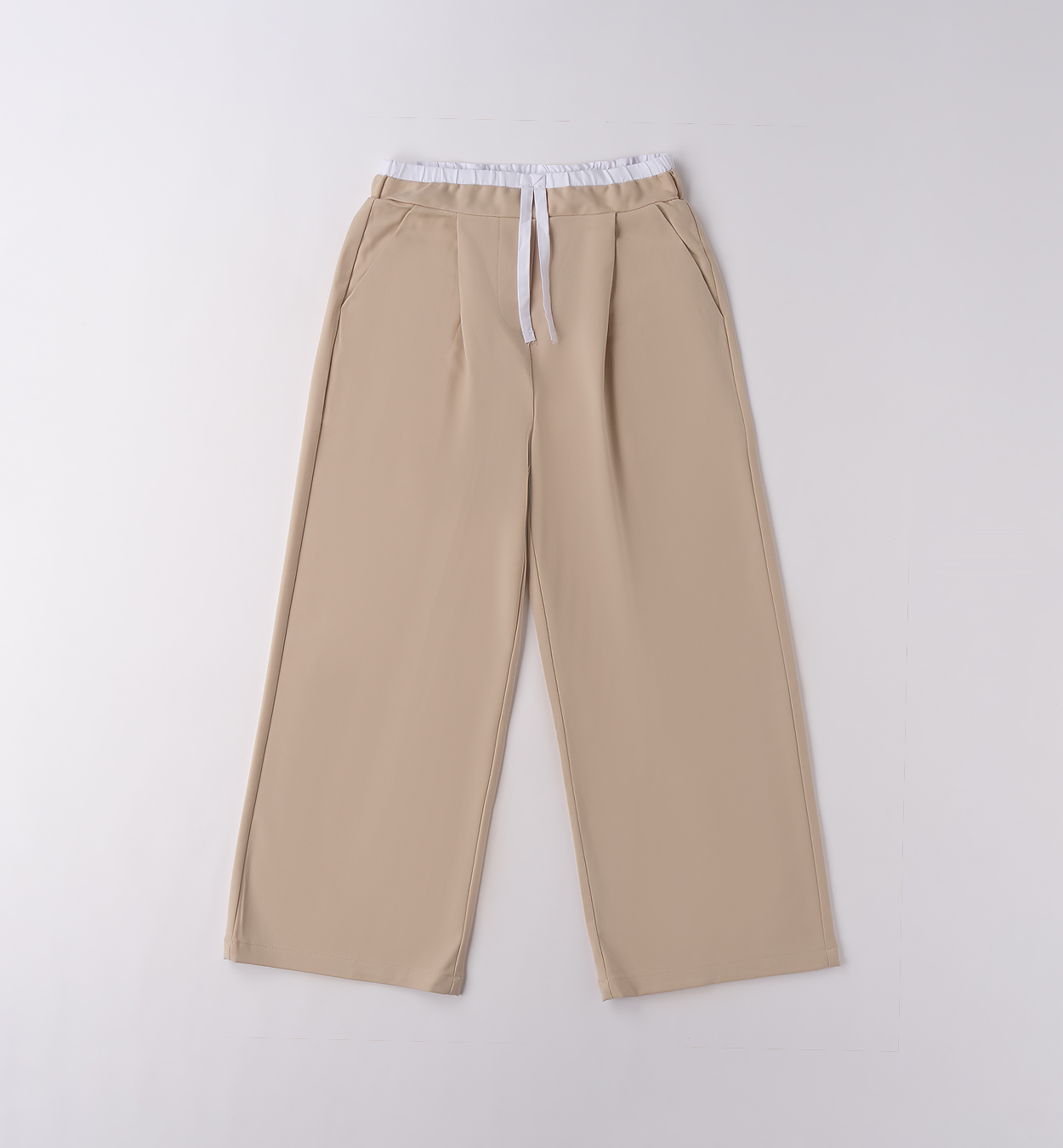 Pantalón confeccionado en sarga elástica con cinturilla elástica bicolor y cordón ajustable.