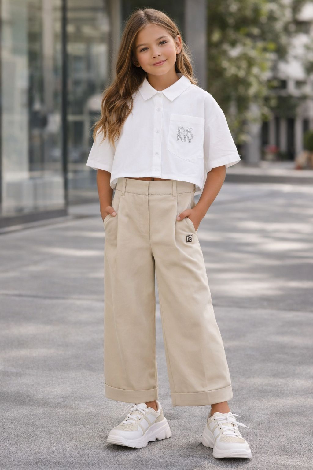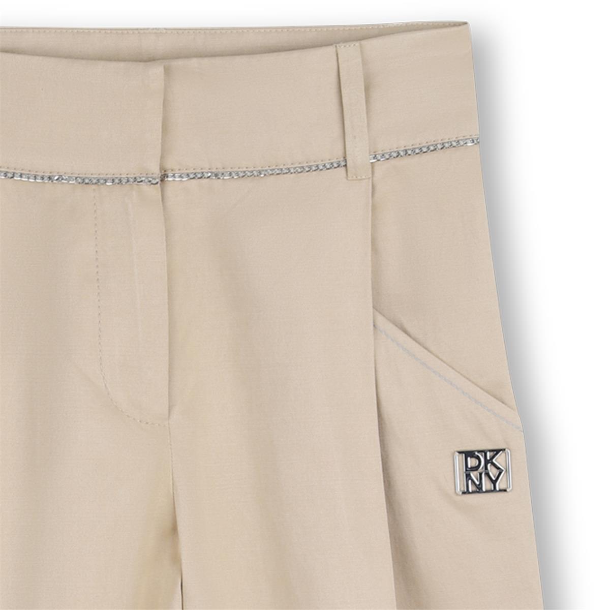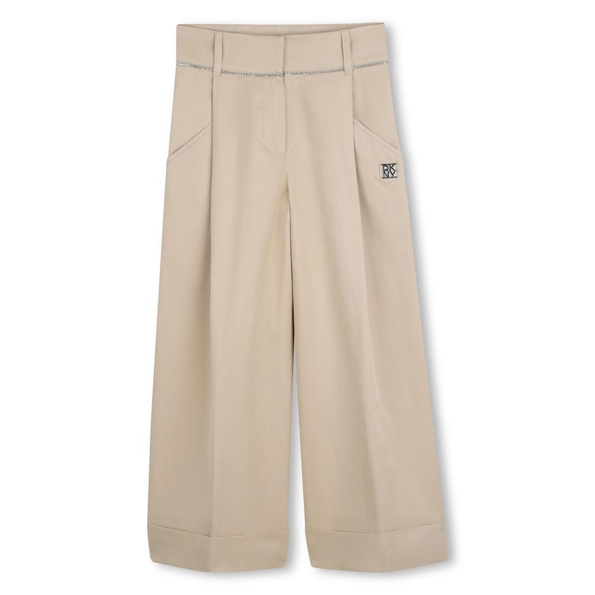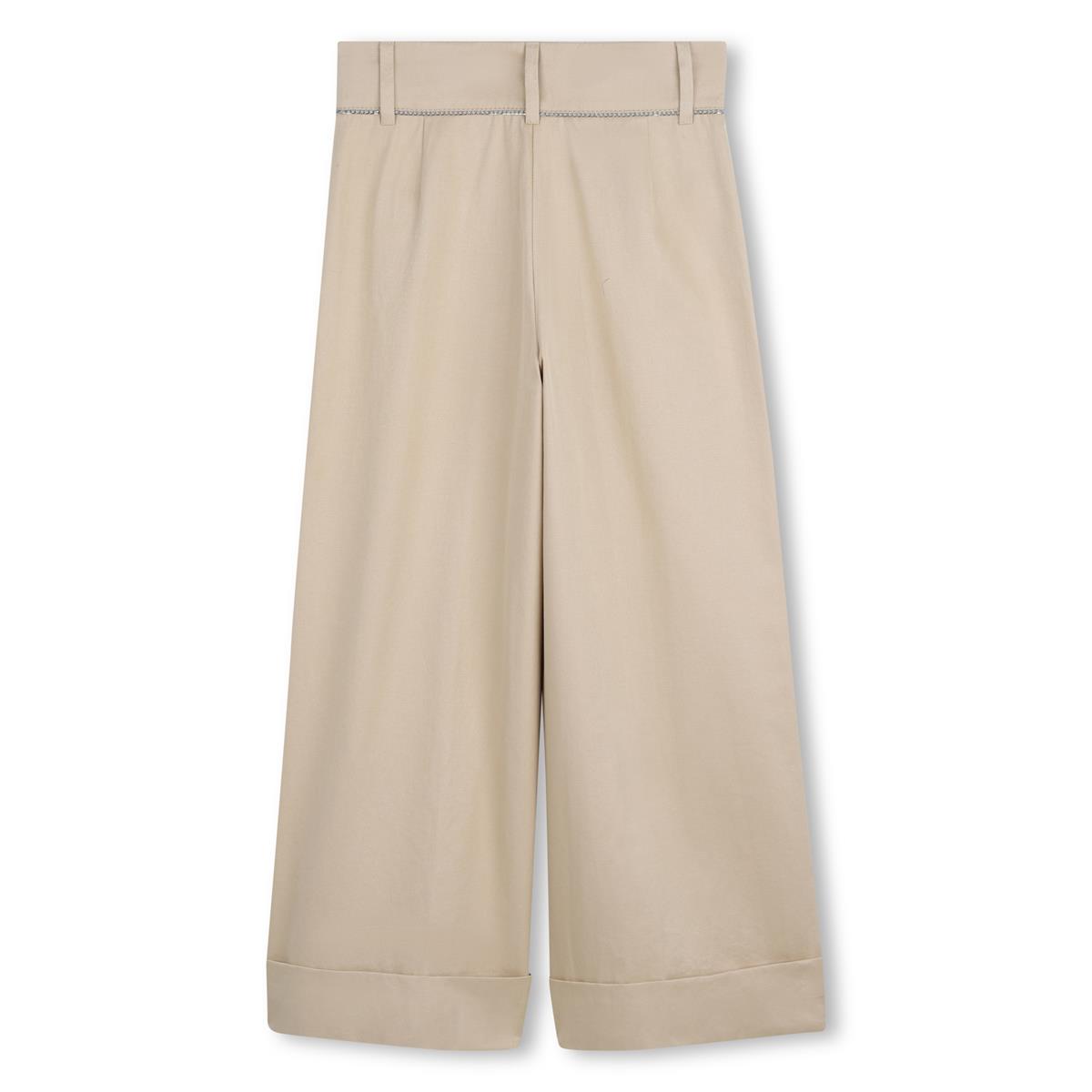 Pantalones anchos de sarga con efecto satinado, 61% algodón, 33% poliéster, 6% poliamida. Detalle de cadena en la cintura. Bolsillos delanteros. Placa metálica en la parte delantera. Cierre de cremallera + gancho metálico.