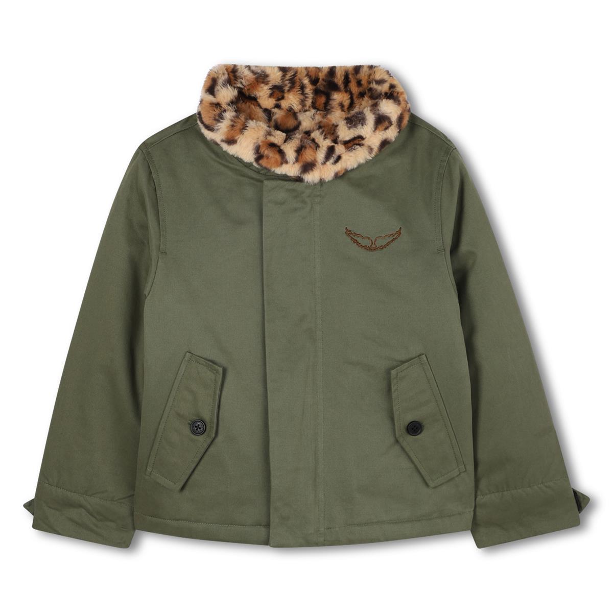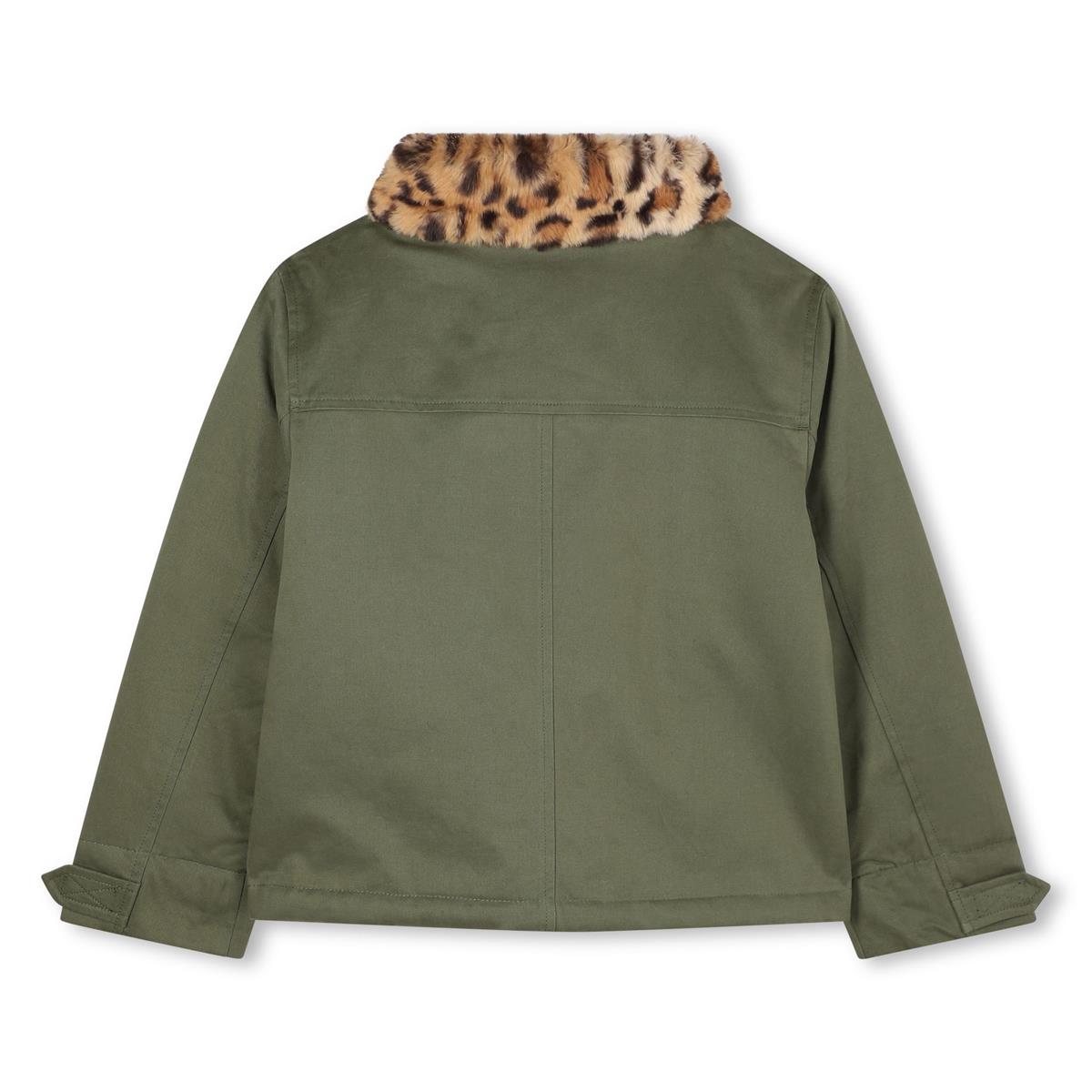 Chaqueta de sarga de algodón impermeable. Corte recto, bolsillos delanteros con solapa. Cuello alto con cierre de velcro. Cremallera con dos botones a presión. Mangas ajustables en los puños. Forro de piel sintética estampada. 100 % algodón.