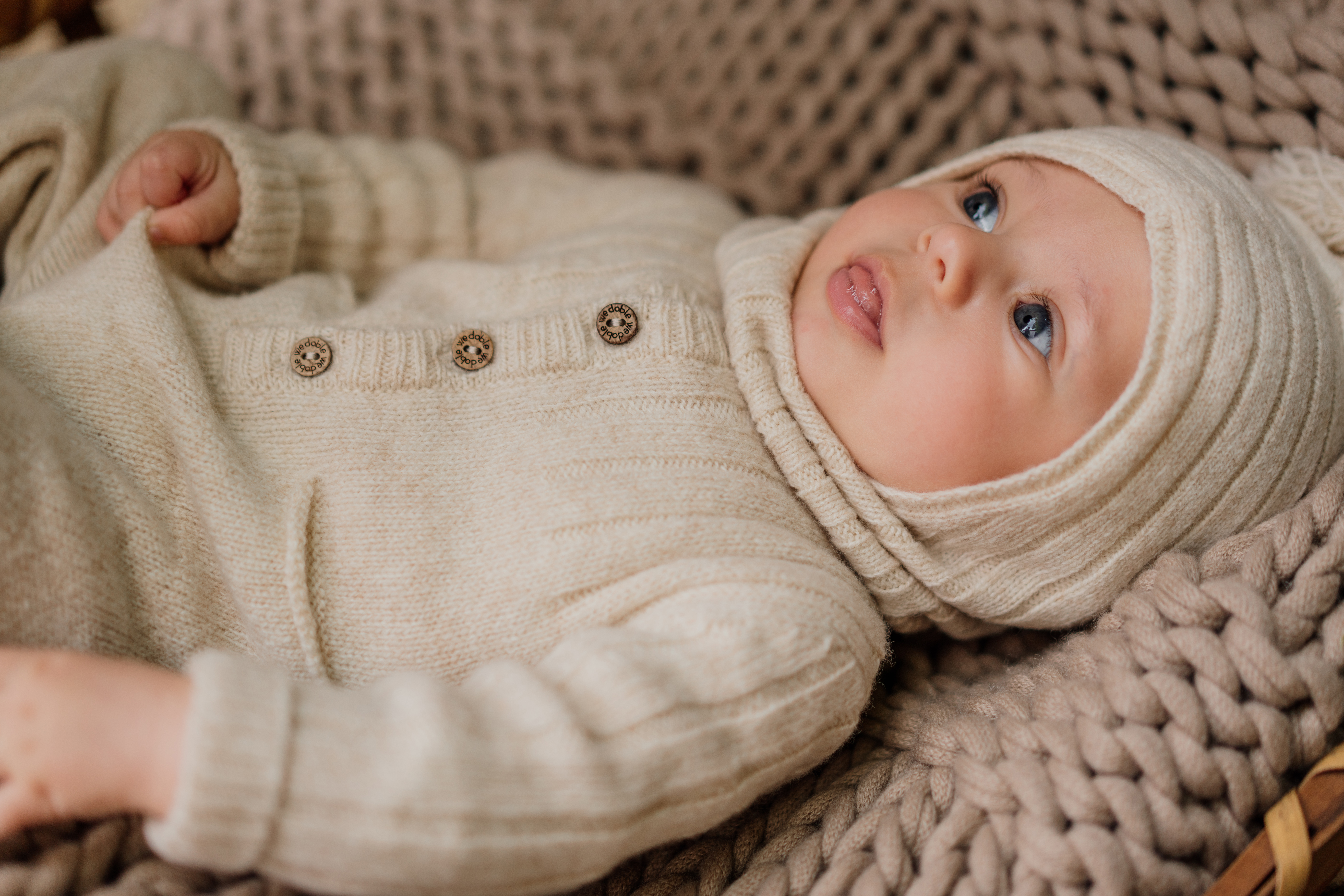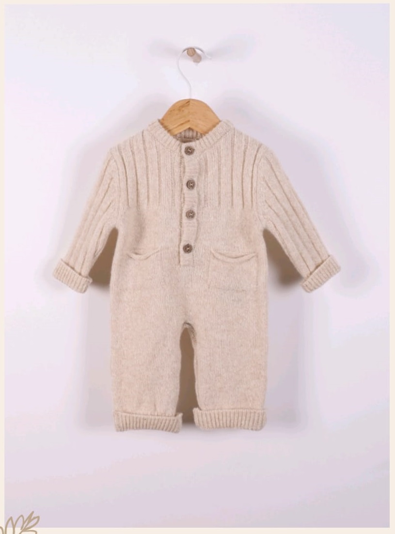 Mono tejido en una preciosa lana merino extrafina, ideal para bebé. El mono se abrocha delante con botones de coco y entre las piernas con automáticos.