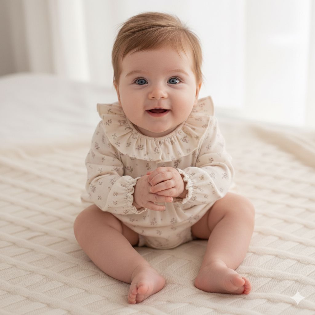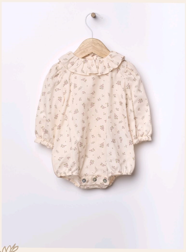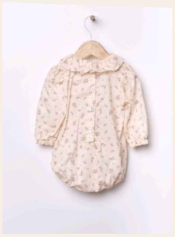 Encantador pelele de manga larga con estampado floral, ideal para bebés, confeccionado en algodón ligero, luce un dulce estampado de flores sobre fondo rosa. Se abrocha en la espalda y entre las piernas con botones de nácar.