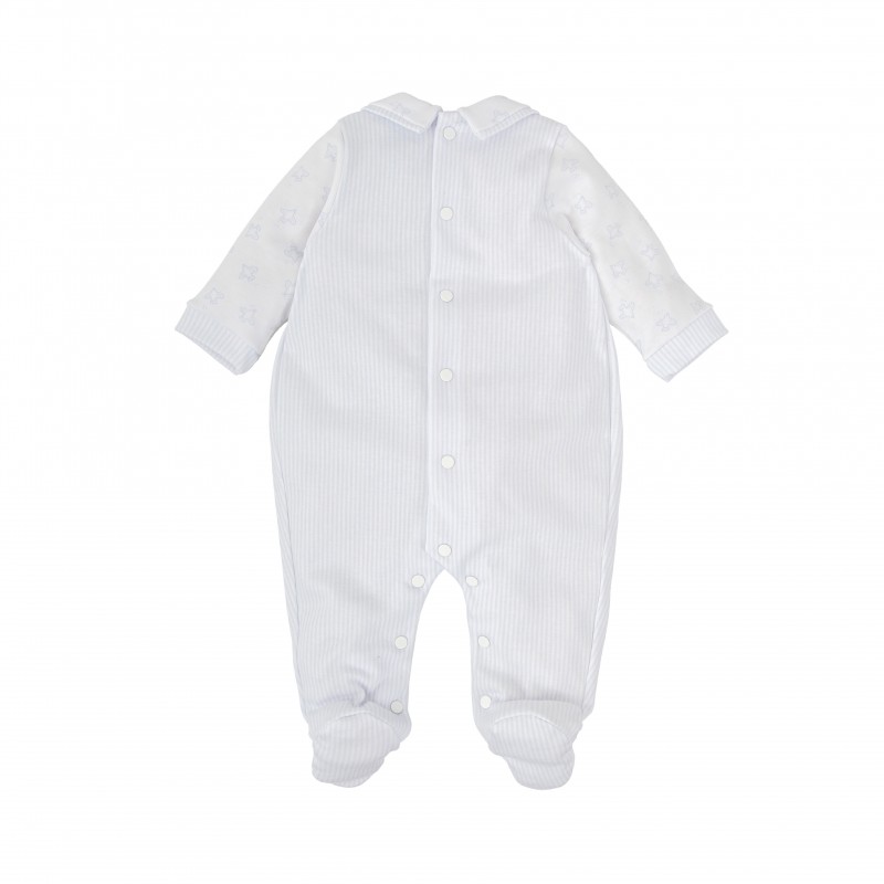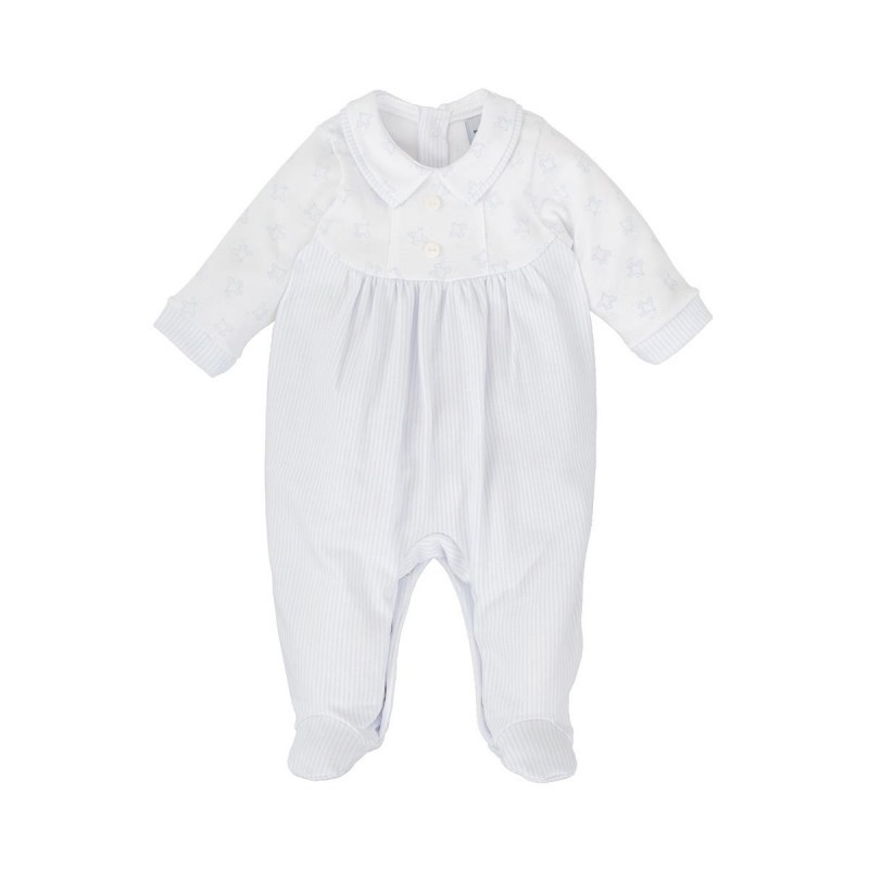 Pelele para bebé combina el confort del algodón 100%  con un diseño clásico lleno de encanto. La parte superior blanca está decorada con un delicado estampado de pajaritos en color celeste. El cuello bebé y los puños a rayas combinan a la perfección con el cuerpo del pelele, confeccionado en tejido a rayas verticales suaves. Los pies cerrados garantizan abrigo y comodidad para el bebé, ideal para el día a día o una ocasión especial durante sus primeros meses.