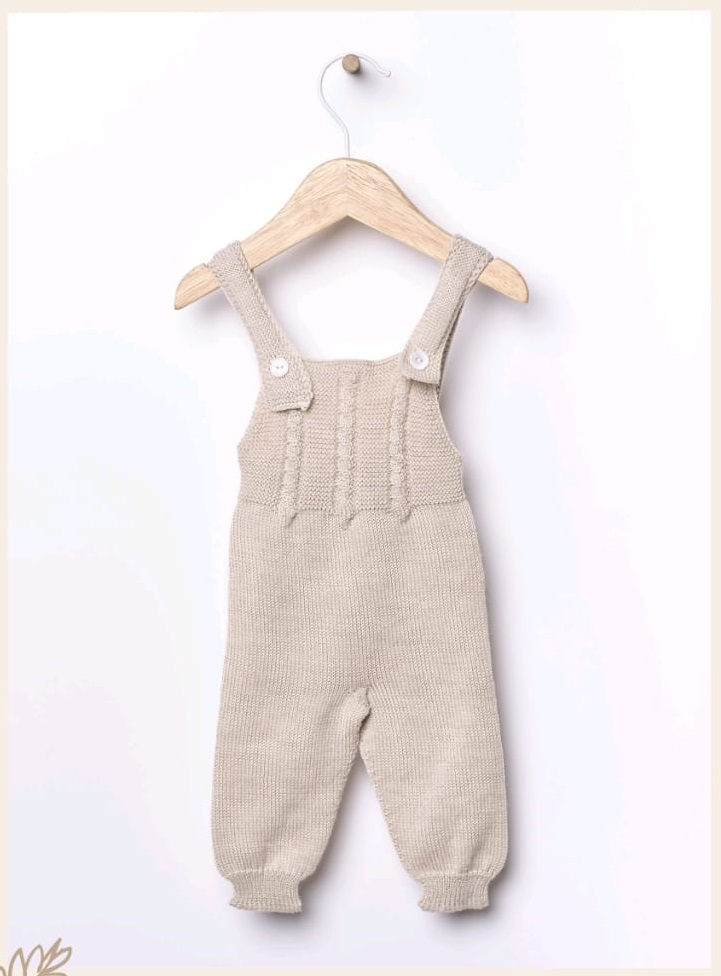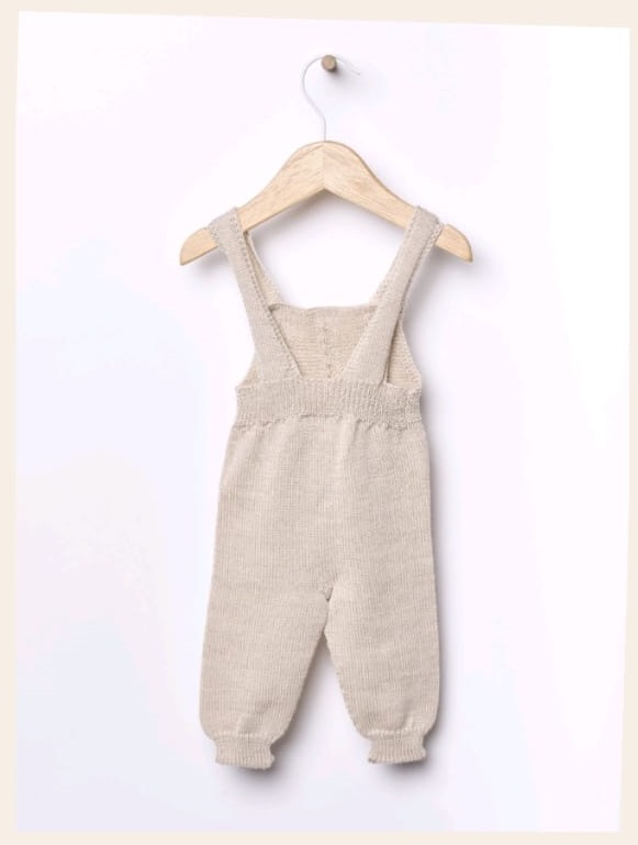 Peto tejido con suavidad en una preciosa lana merino extrafina, ideal para bebés. El peto se cierra con botones de nácar en los tirantes, esta prenda no tiene costuras para la máxima comodidad de tu bebé.