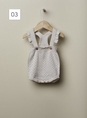 Ranita tejida en malla fina de algodón orgánico suave y transpirable, ideal para bebés, se abrocha en la espalda y entre las piernas con botones de madera, de una sola pieza sin costuras, para el máximo confort de tu bebé.