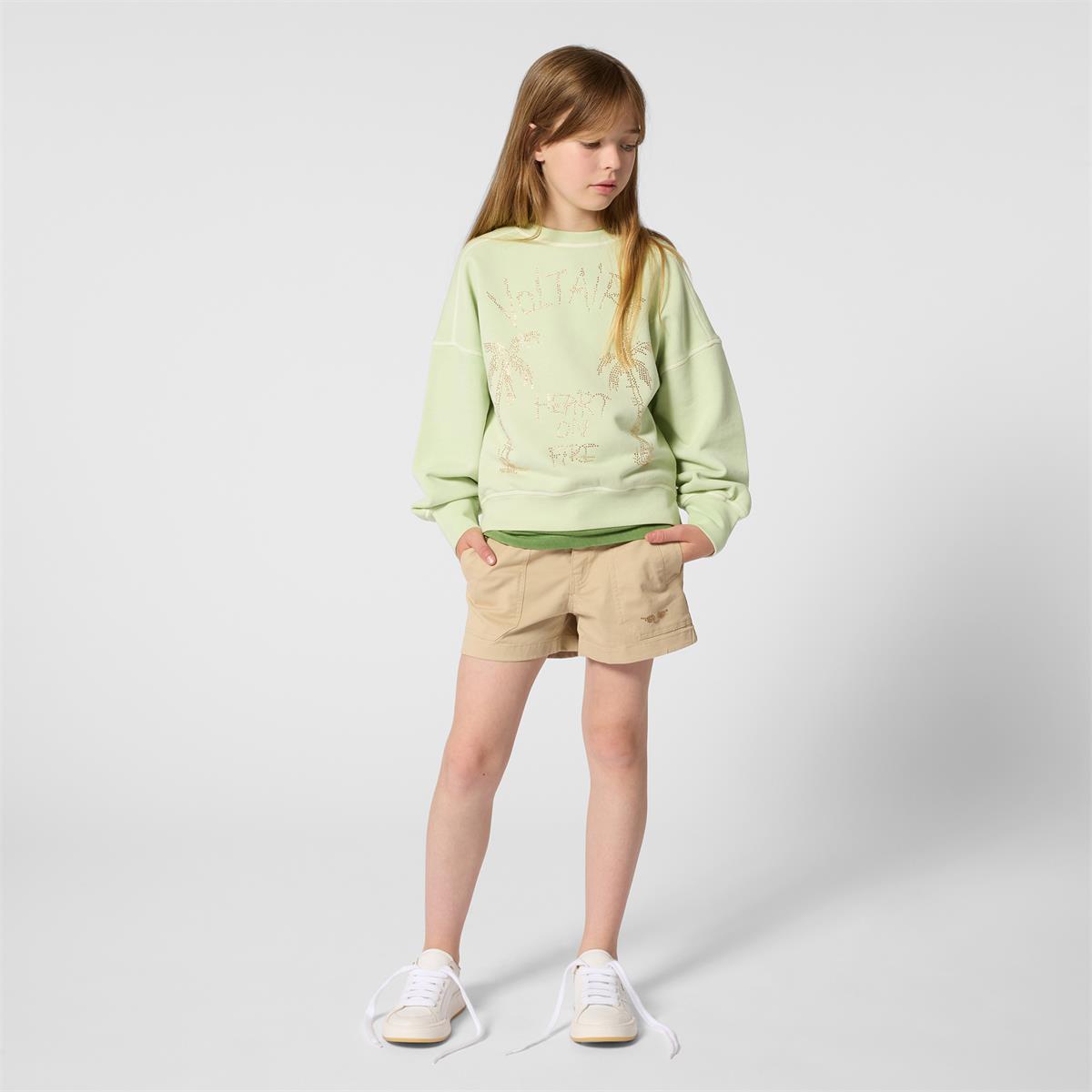 Shorts de sarga. Bolsillos ribeteados cuadrados con ala de pedrería en la parte delantera y un bolsillo ribeteado en la parte trasera.98 % algodón, 2 % elastano.