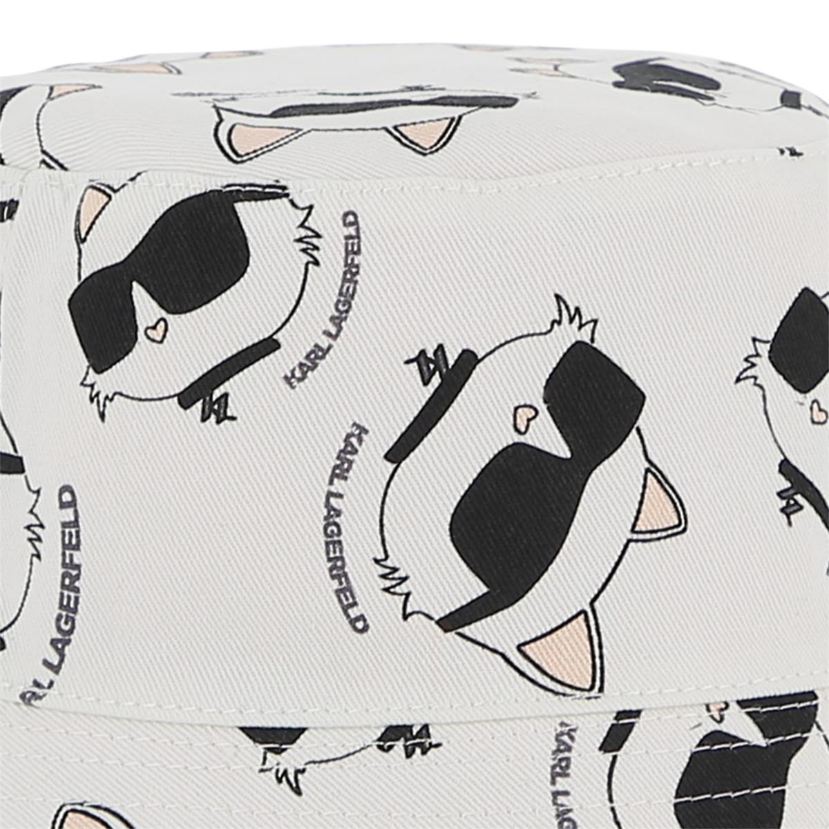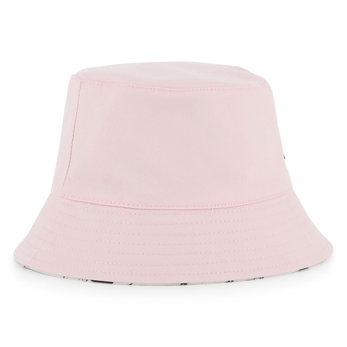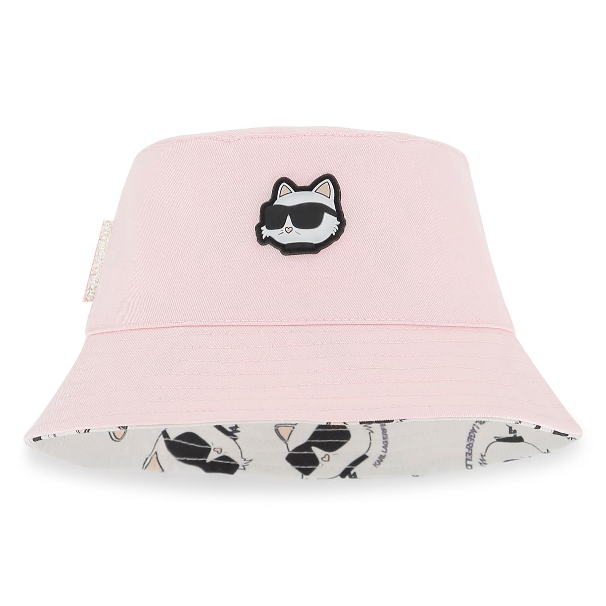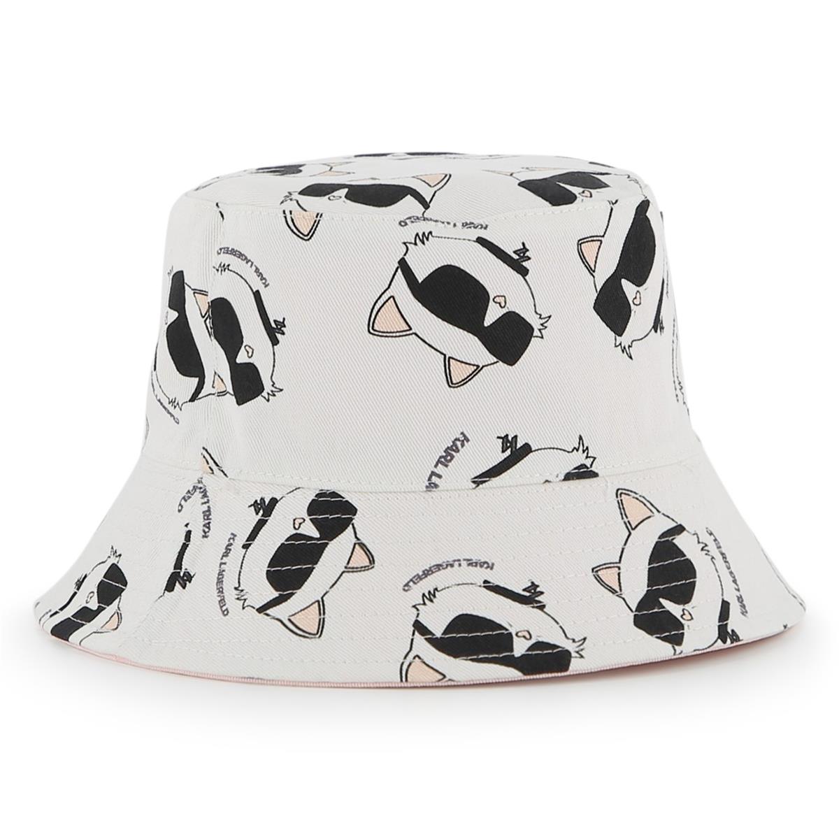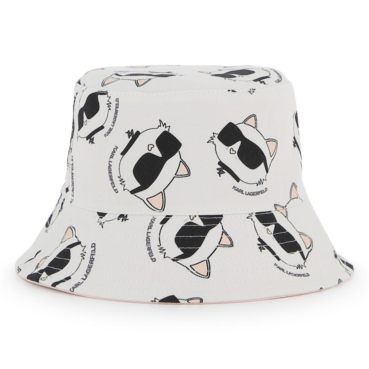 Sombrero tipo pescador reversible. Sarga de algodón. Lado 1: color liso + parche de goma con el logo de CHOUPETTE. Lado 2: estampado integral de CHOUPETTE.