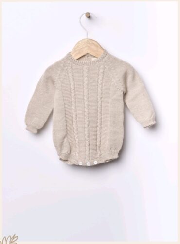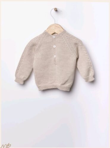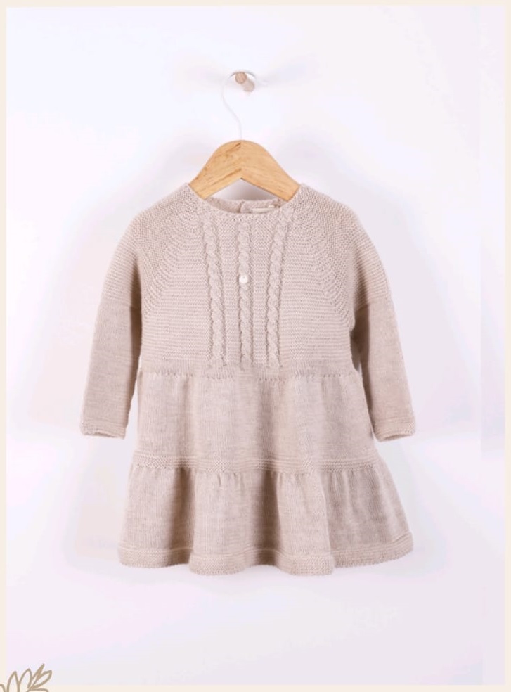 Vestido tejido en suave lana merino, ideal para bebés. El vestido de manga larga se abrocha en la espalda con botones de nácar, esta prenda no tiene costuras para la máxima comodidad de tu bebé.