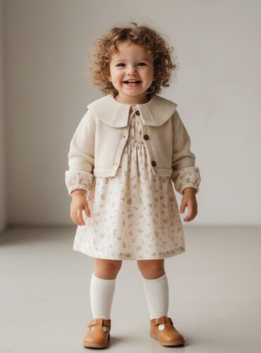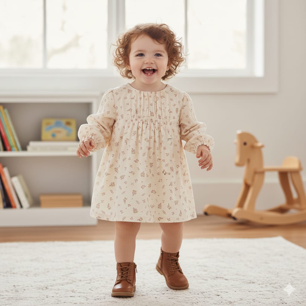 Vestido de manga larga, ideal para niñas. El vestido está confeccionado en algodón ligero con un dulce estampado de flores sobre fondo rosa y forrado para mayor comodidad. Se abrocha en la espalda con botones de nácar.