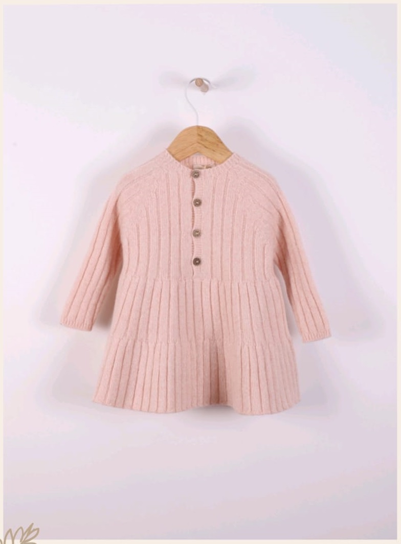 Vestido de punto suave en una preciosa lana merino extrafina, se abrocha por delante con botones de coco, Esta prenda no tiene costuras para la máxima comodidad de tu bebé.
