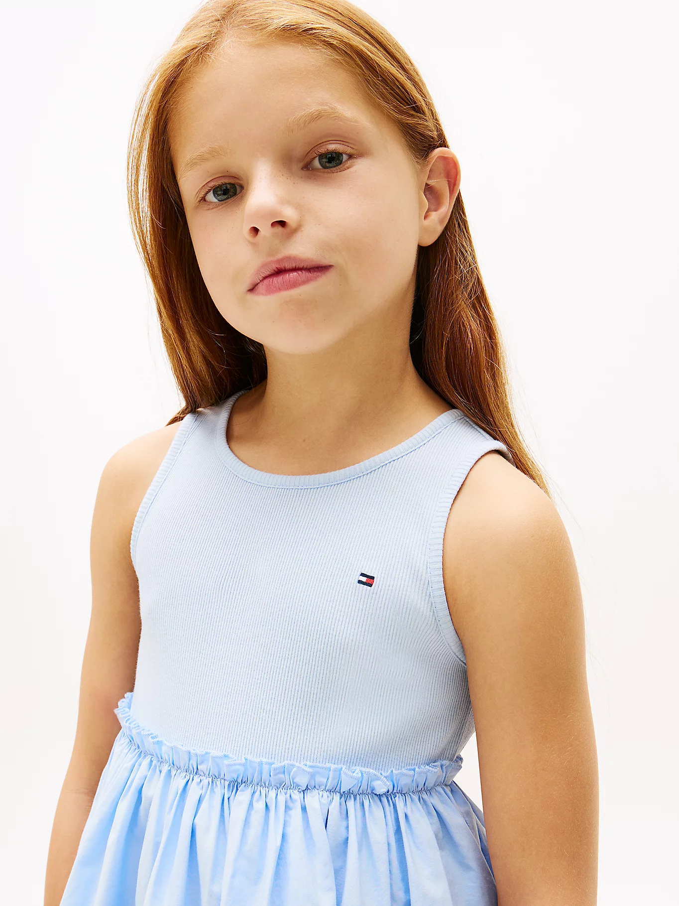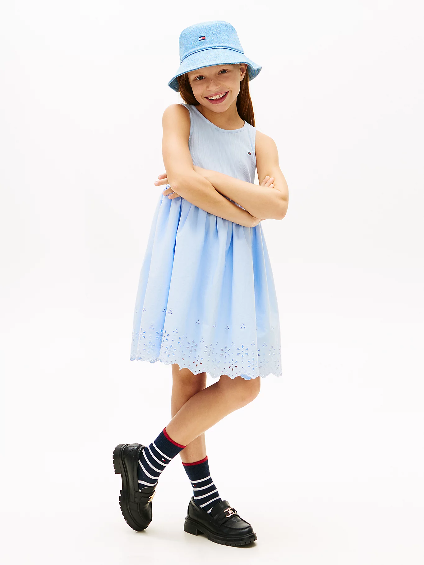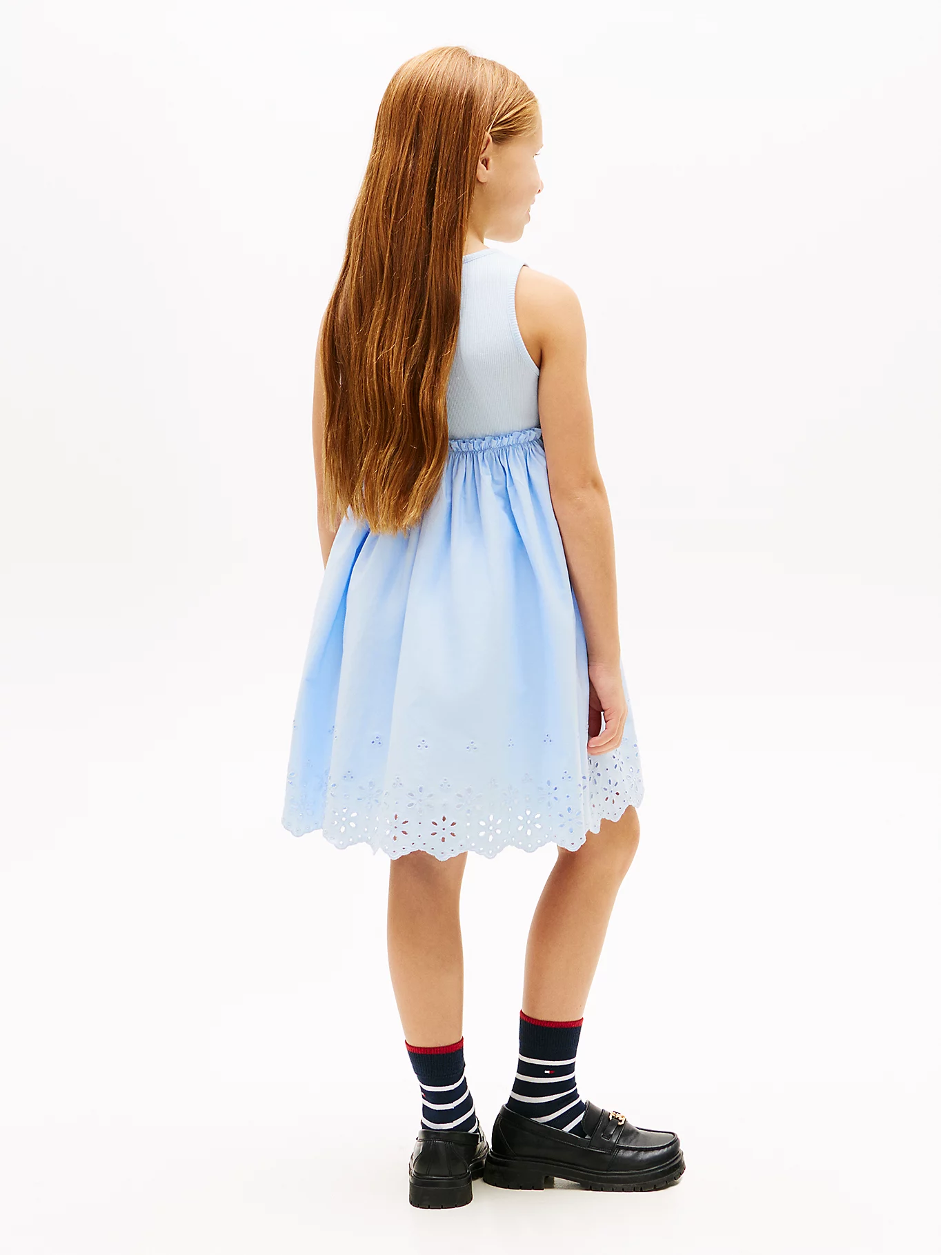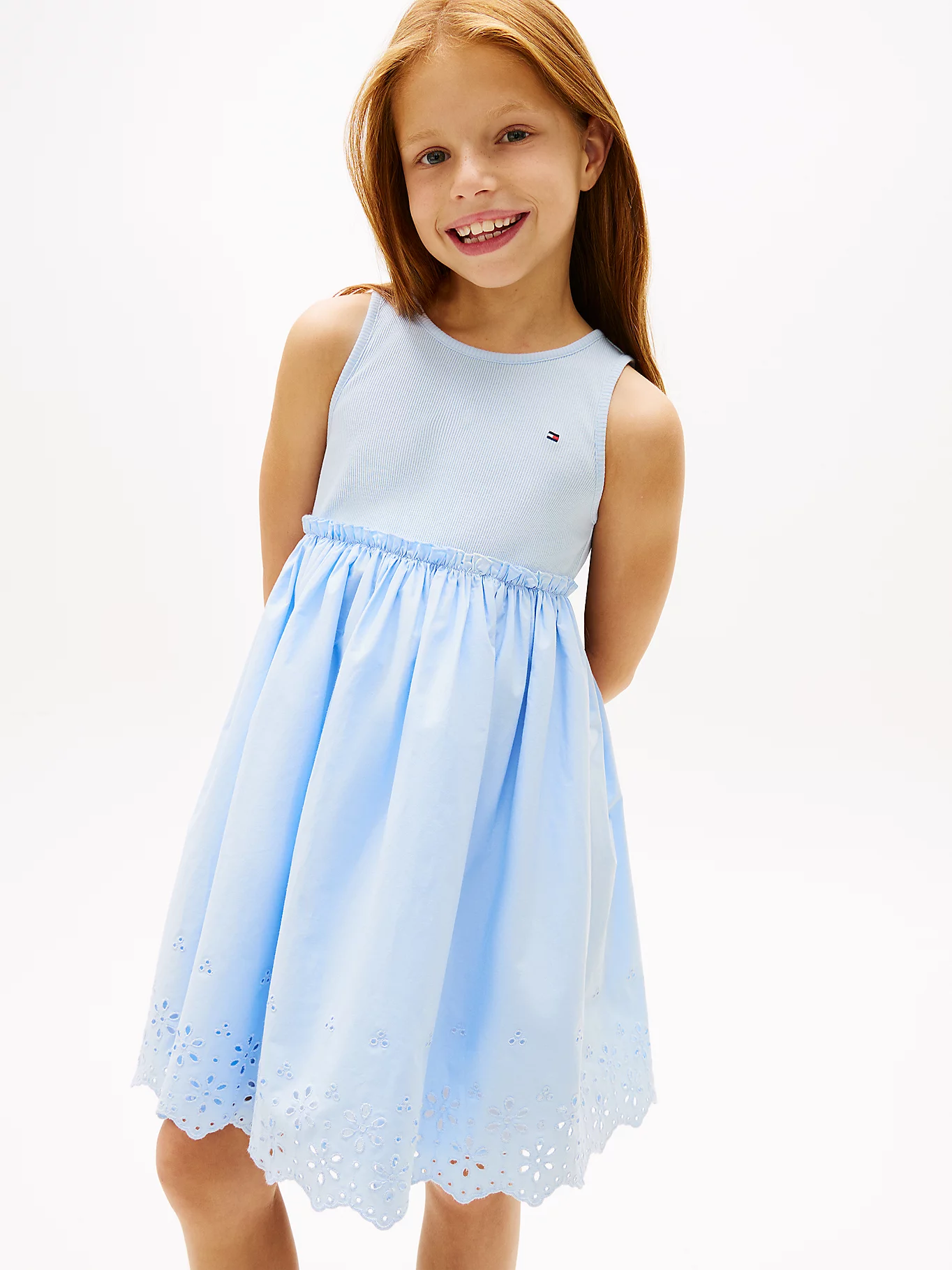 Vestido que combina un cuerpo de punto elástico estilo camiseta con una falda de encaje inglés. Popelín de puro algodón, Cuello redondo, Cuerpo acanalado. Falda con detalles calados, Cintura fruncida, Corte regular, Sin mangas. Corte evasé